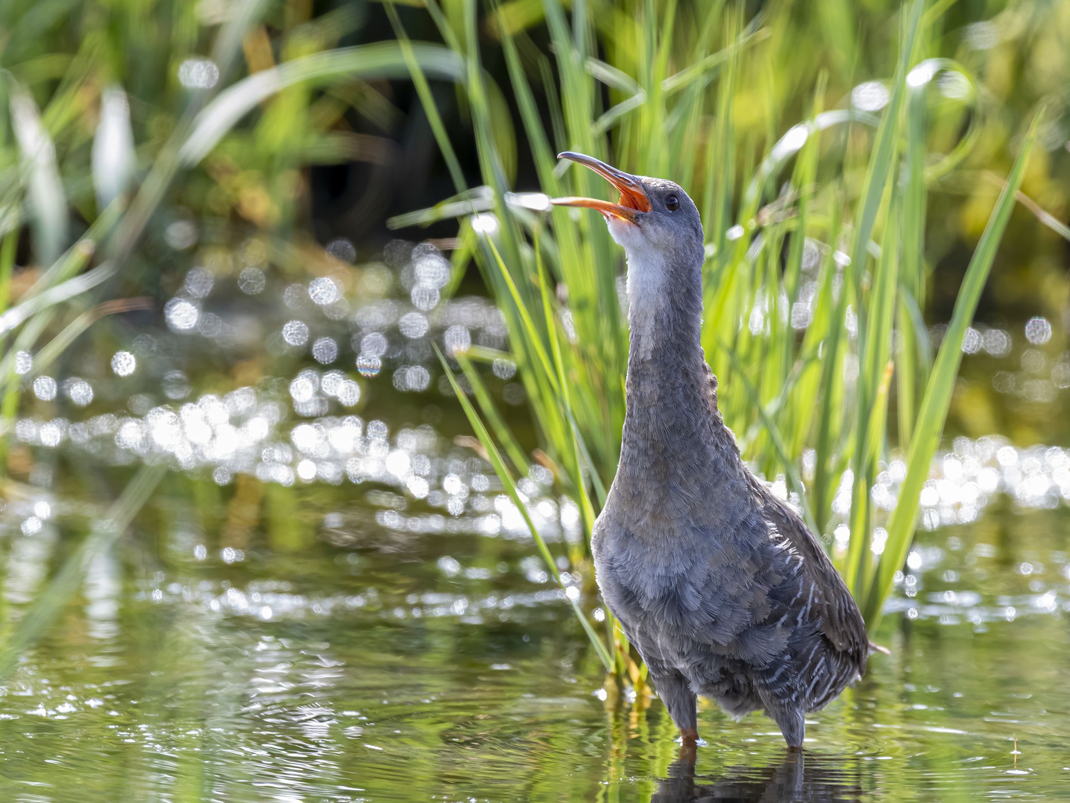 Rálido grande, generalmente pardusco, pero el plumaje varía según la localidad. Puede parecer muy similar a King Rail. Las aves de la costa del Atlántico son de color marrón grisáceo opaco con pocas características contrastantes; ligeramente barrado de gris y blanco en los lados y pico anaranjado pálido. La población de la Costa del Golfo es más brillante con cuello anaranjado, más similar a King Rail; sin embargo nota el barreado más pálido y difuso en los lados y rayas oscuras menos contrastes en la espalda. Casi siempre se encuentra en salinas cerca de la costa, donde puede ser abundante y vocal. Nunca en los pantanos continentales de agua dulce, donde es reemplazado por King Rail. Normalmente tímido, pero regularmente visto alimentándose a lo largo del borde de los canales. Escucha por una serie de notas ásperas "kek" o gruñidos fuertes y ásperos que salen de los humedales. Donde se juntan el agua dulce y salada a veces hibrida con King Rail. Algunos individuos es mejor dejarlos sin identificar.