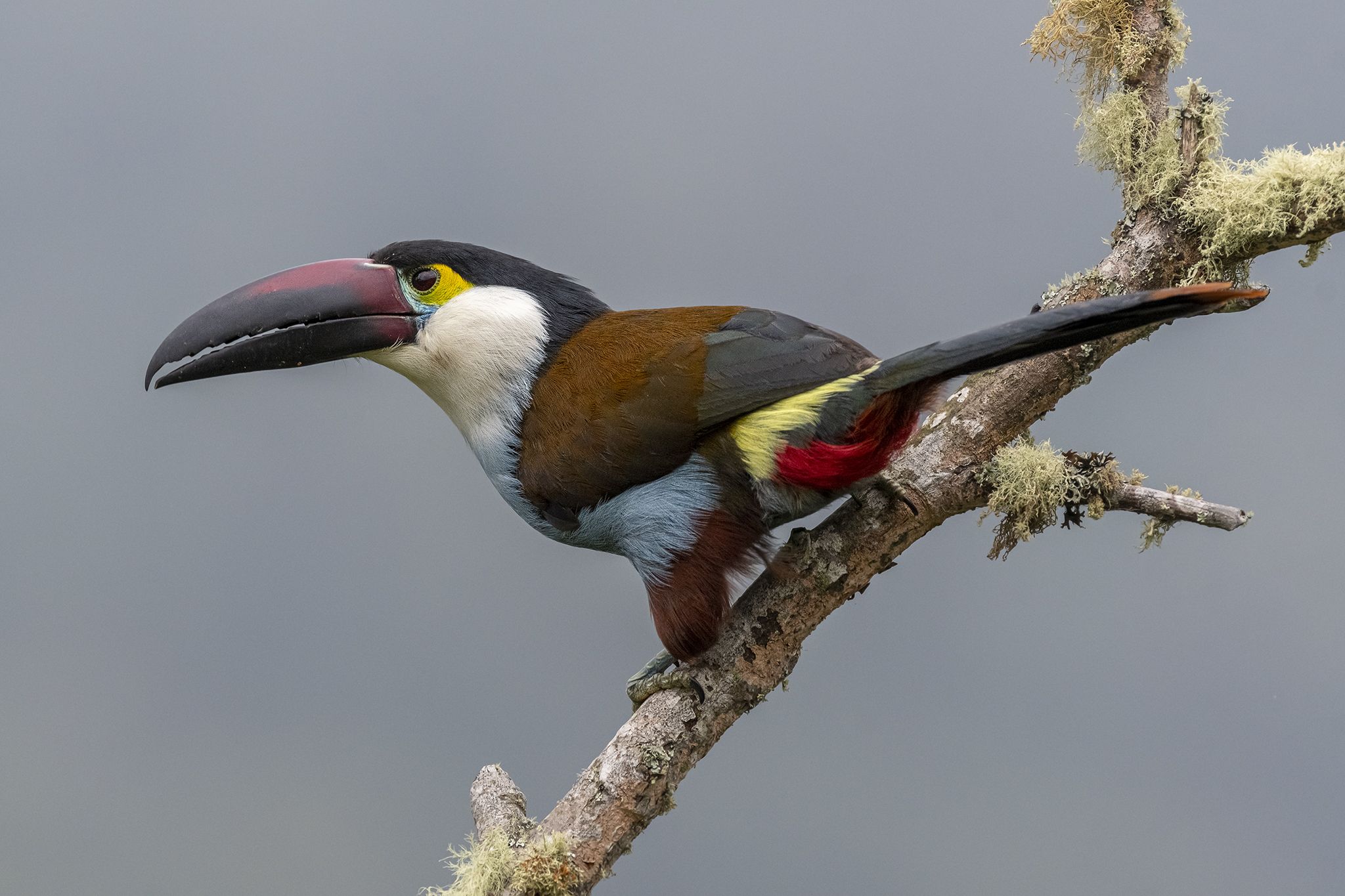 Tucán distintivo de bosques montanos de los Andes desde Venezuela hasta el extremo noroeste de Perú. Fácil de identificar con una gorra negra, pico oscuro, garganta blanca, vientre azul pálido y las partes superiores mayormente marrón. Ocurre entre 1,500–2,500 m, típicamente por debajo del rango altitudinal de Gray-breasted Mountain-Toucan, pero ocasionalmente hay algún traslape. Poco común; usualmente se encuentran solos o en parejas en el dosel del bosque, a menudo cerca de árboles con frutos.