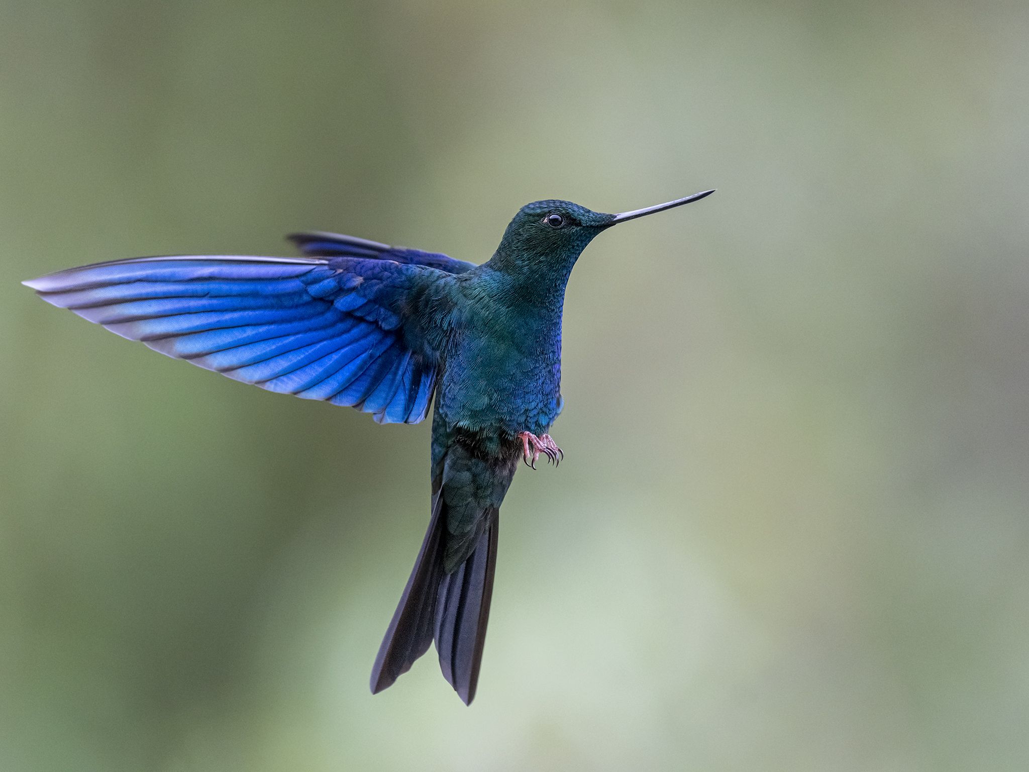 Un colibrí enorme y espectacular. Los machos son esmeralda brillante con alas azules. Las hembras son verdosas arriba con las partes inferiores color canela. El pico es de longitud media y ligeramente curvado hacia arriba. Más grande que casi todos los demás colibríes y con aleteos más lentos en comparación a los de otros colibríes. Ocurre en bosques montanos y bordes en los Andes desde el norte de Colombia hasta Bolivia, típicamente desde alrededor de los 2,800 m hasta cerca de la línea de árboles. Visita comederos.