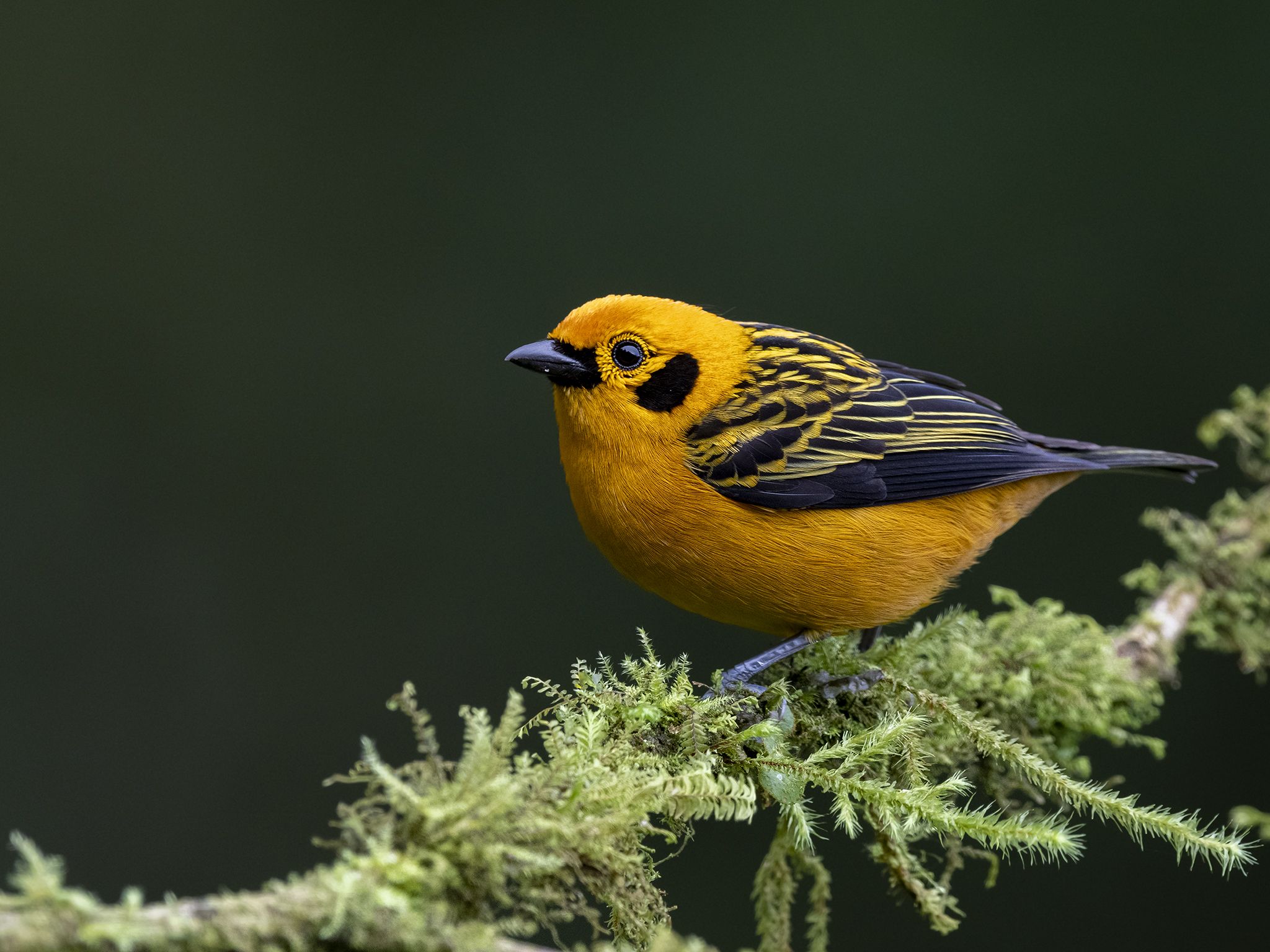 Tangara pequeña que se encuentra en las estribaciones andinas y la zona subtropical desde Venezuela a Bolivia. Mayormente amarillo dorado brillante con un parche del oído negro, espalda rayada, y alas y cola en su mayoría negras. Hay alguna variación entre poblaciones, las aves más al norte tienen una banda en el pecho y los flancos color castaño. Sexos iguales; los juveniles son amarillo más opaco. Una de las tangaras más comunes en bandadas mixtas de entre 900–2.200 m, en bosque nuboso, bordes y jardines.