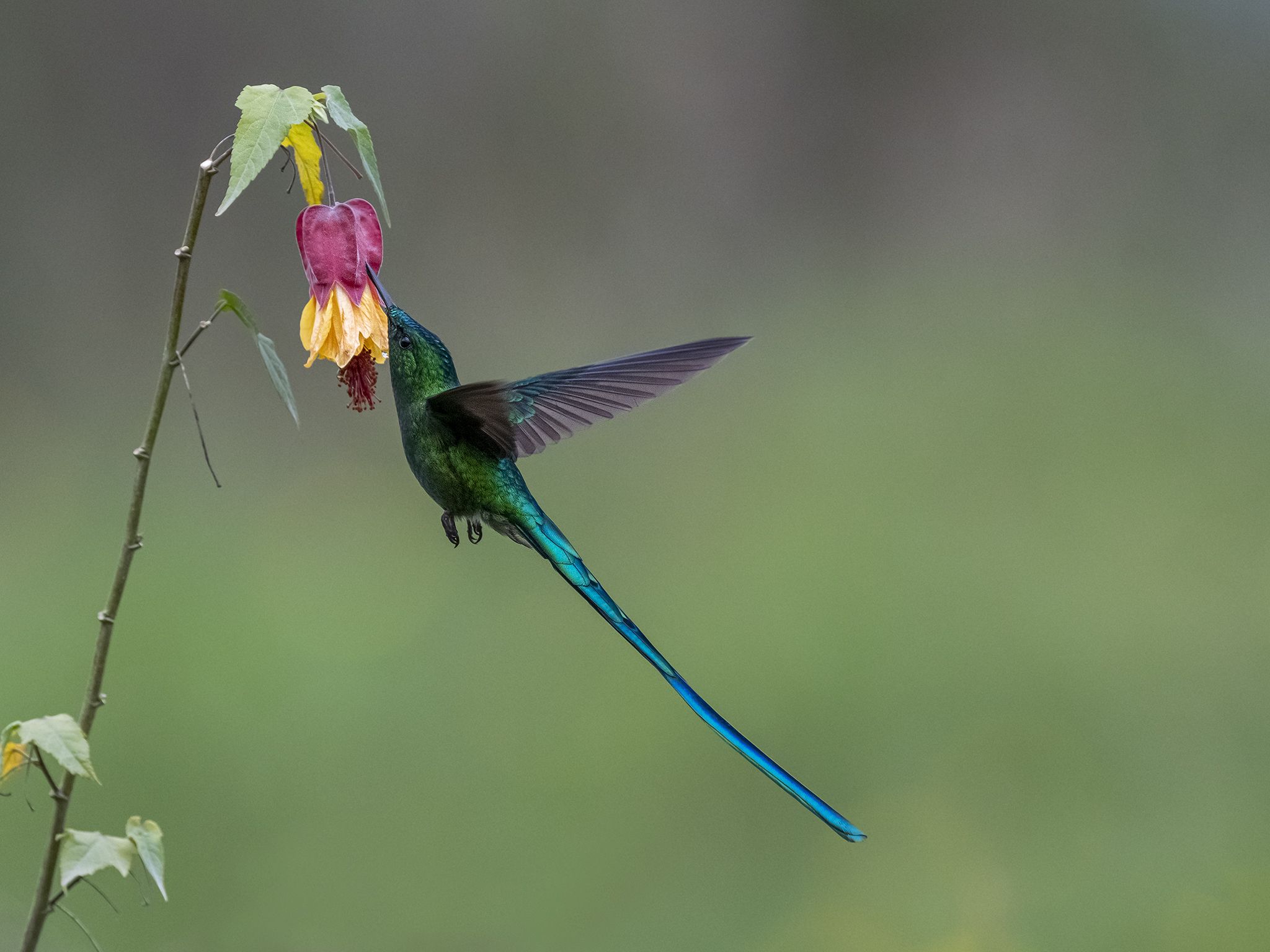 Colibrí llamativo con cola extremadamente larga. El macho es mayormente verde esmeralda con garganta azul verdosa y cola larga bifurcada. La hembra es muy diferente, con cola más corta, garganta moteada, vientre beige y un bigote blanco corto. Principalmente se encuentra en la ladera este de los Andes desde Venezuela a Bolivia, en las estribaciones y zonas subtropicales desde 1,200–2,500 m. Ocurre dentro del bosque nuboso y en los bordes. Visita comederos. El macho es superficialmente similar a los trainbearers, pero nota que ocurre en un hábitat diferente.