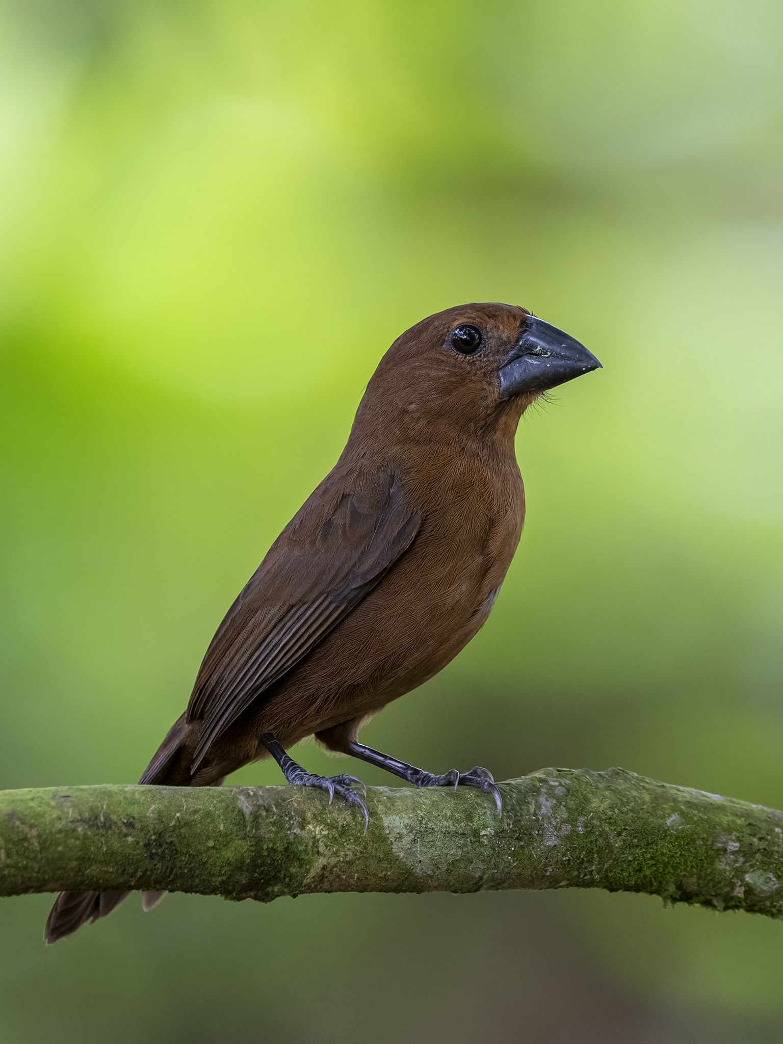 Ave fornida y con pico grueso, de bosque húmedo siempreverde y bordes en tierras bajas tropicales. Generalmente se encuentran en parejas, a menudo esculcando en los niveles bajos a medios de la vegetación densa. Una típica vista implica que se ve simplemente oscuro. En comparación con los colorines: nota el tamaño grande, pico muy grueso y la cola ancha que puede ser movida de lado a lado. El macho es totalmente azul-negro profundo. La hembra es totalmente marrón oscuro. La llamada es un chillido agudo, bastante distintivo y que a menudo es duplicado.