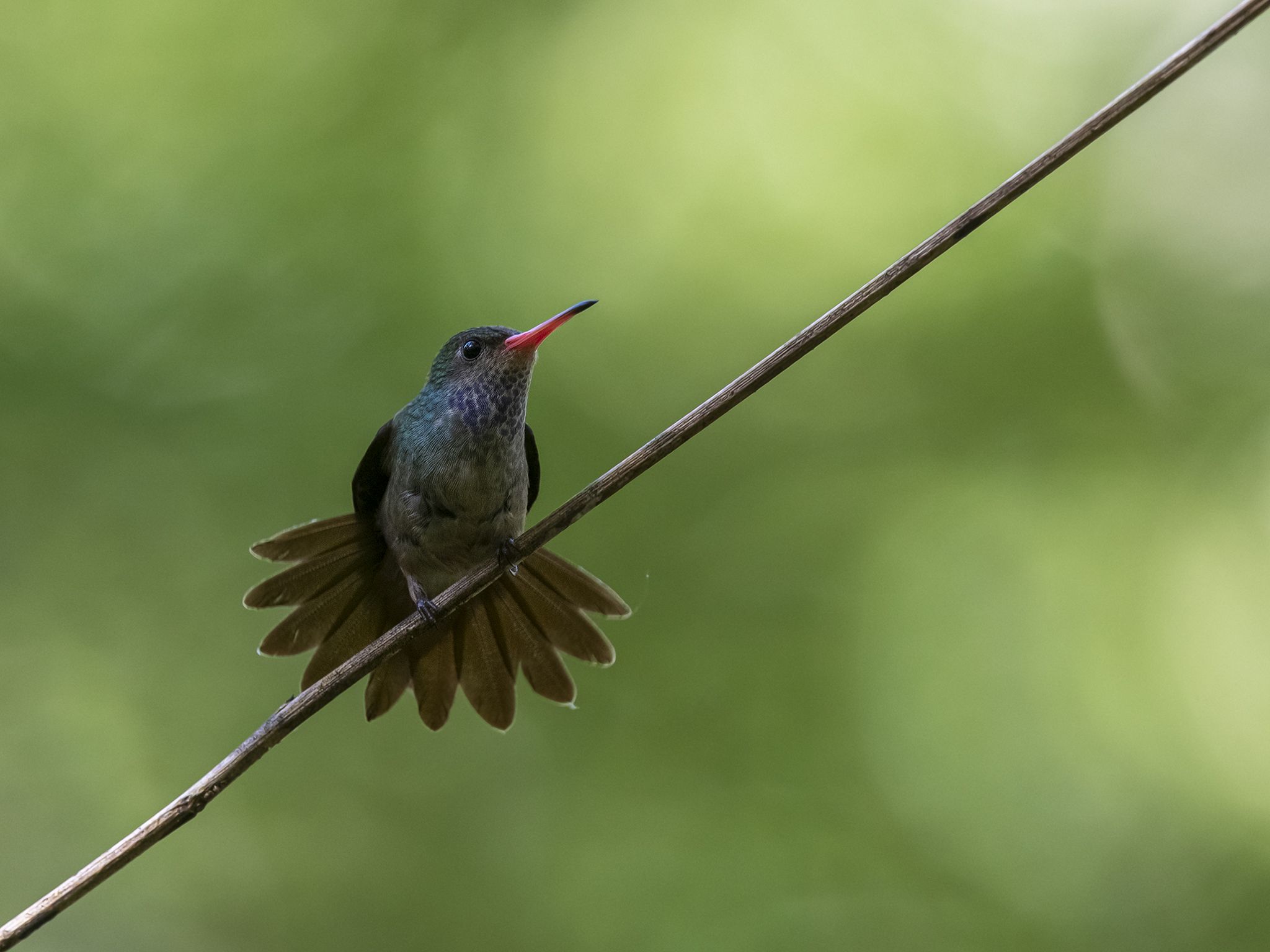 El macho es distintivo con un pico rojo brillante, una garganta azul y una cola color oro. En poca luz, podría ser confundido con Rufous-tailed Hummingbird. Las hembras son más opacas; la garganta azul o verdosa a menudo parece moteada y pálida. Ella también tiene una cola color oro y al menos la base inferior del pico es roja. Se encuentra en los hábitats más abiertos o más secos de bosques, incluyendo bordes y crecimiento secundario. A menudo, varios machos se reúnen y cantan en un sitio de exhibición llamado lek.