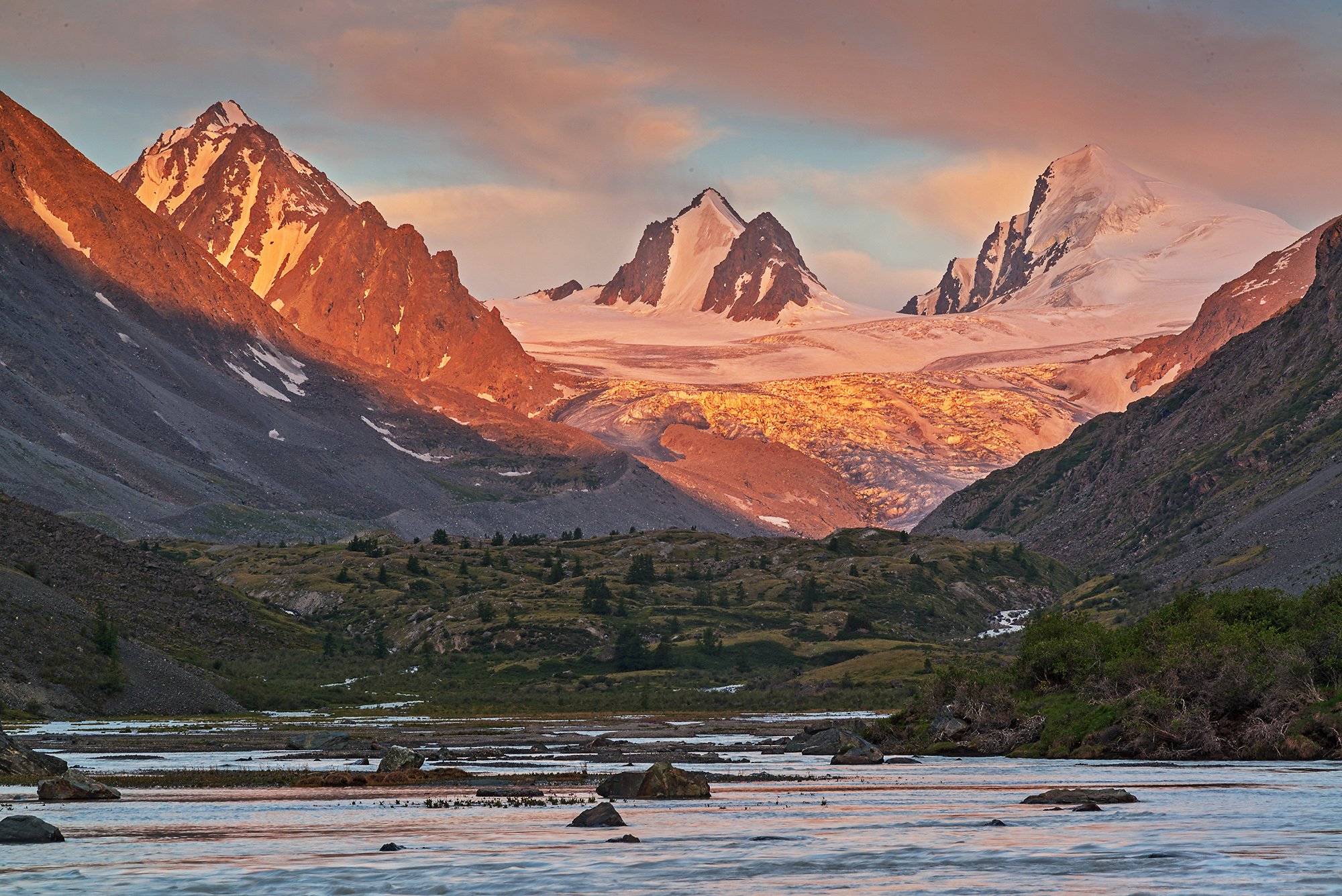 Река Акколь. Софийский ледник. Вершины Сестра, Ксения и Брат. Алтай