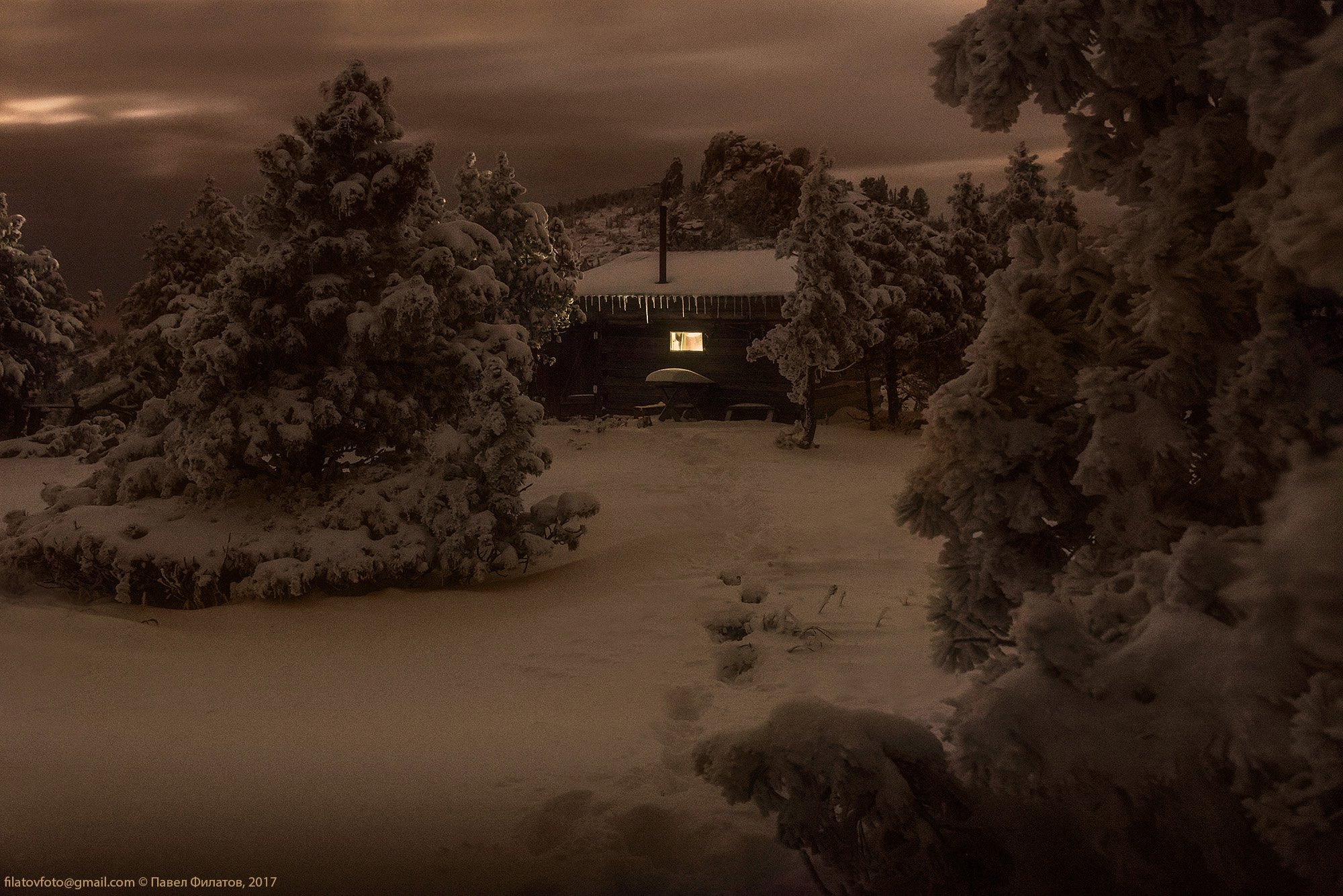 А в это время из-за тяжелых снежных туч выглянула луна и плеснула свою сепию на Пихтовый Шкиль, укутанную облаками Разработную, заснеженную тайгу и крышу избушки, в которой два охотника за светом, укрылись от ненастья и мечтают поймать мимолетные мгновения Красоты среди этих бескрайних тигирекских просторов.