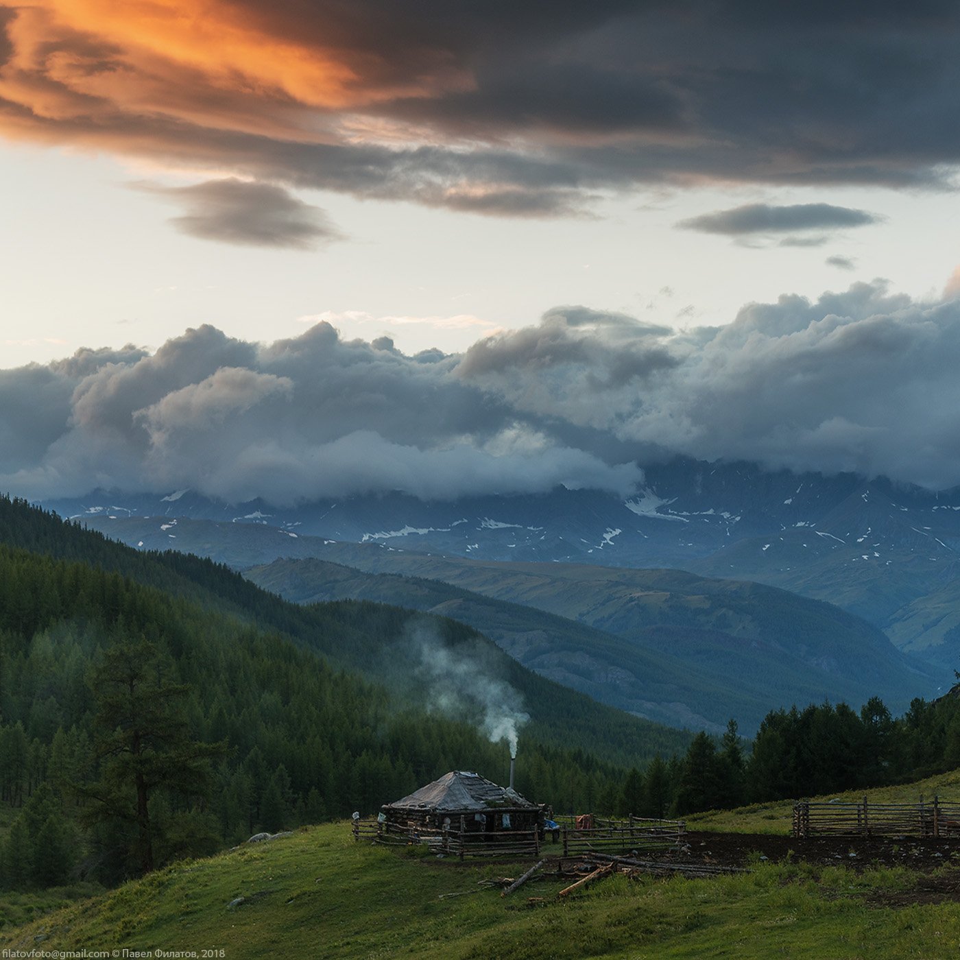 алтай, сибирь, закат, дом, стоянка, дым,, Павел Филатов