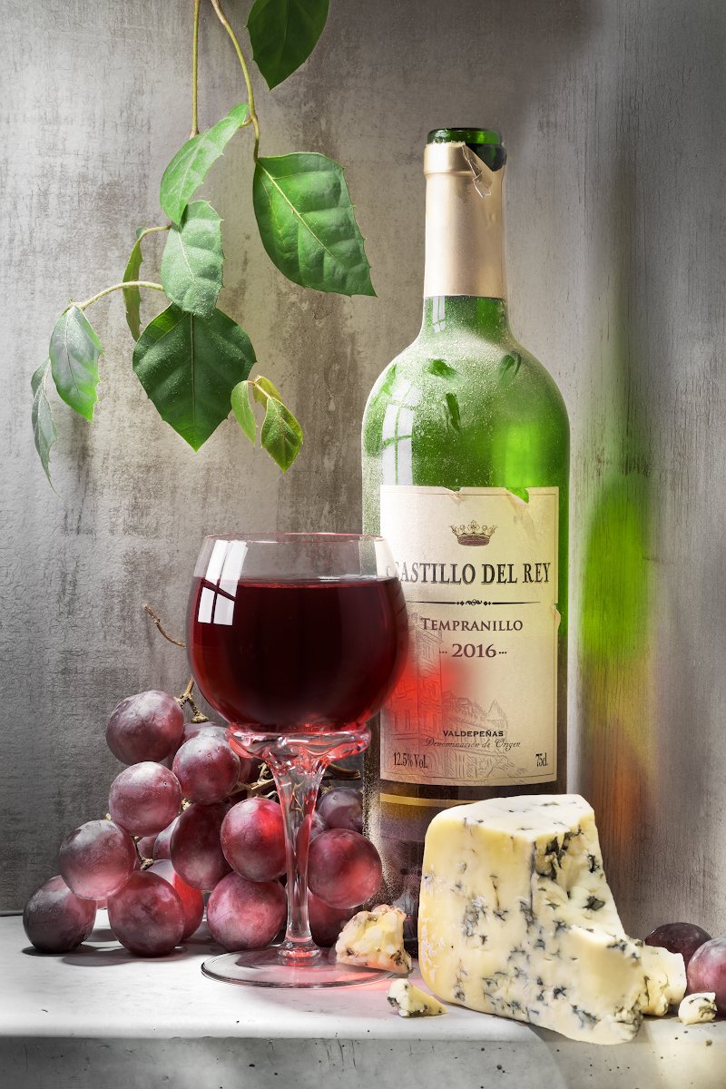 Далее естественным образом в кадр запросился виноград и красное вино, причём непременно в зелёной бутылке – в пику цвету жидкости, которая, как и стекло, должны были ещё и поработать на просвет.
