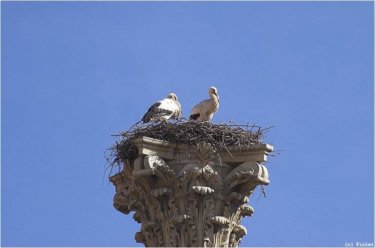 Аисты - главная беда всех городов Испании, где есть какие-либо достопримечательности. Во-первых, гнездо аиста весит до 100 кг. Во-вторых, - продукты их жизнедеятельности разъедают камень. В-третьих - они любят вить гнёзда на самых главных достопримечательностях города. А ещё, как сказал нам гид...они приносят детей! :)