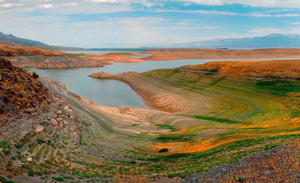 Водохранилище Кировской ГЭС на севере Киргизии. Вдали виднеются первые отроги Западного Тянь-Шаня. По прибрежным скалам хорошо видно как сильно и часто изменяется уровень воды в водоеме