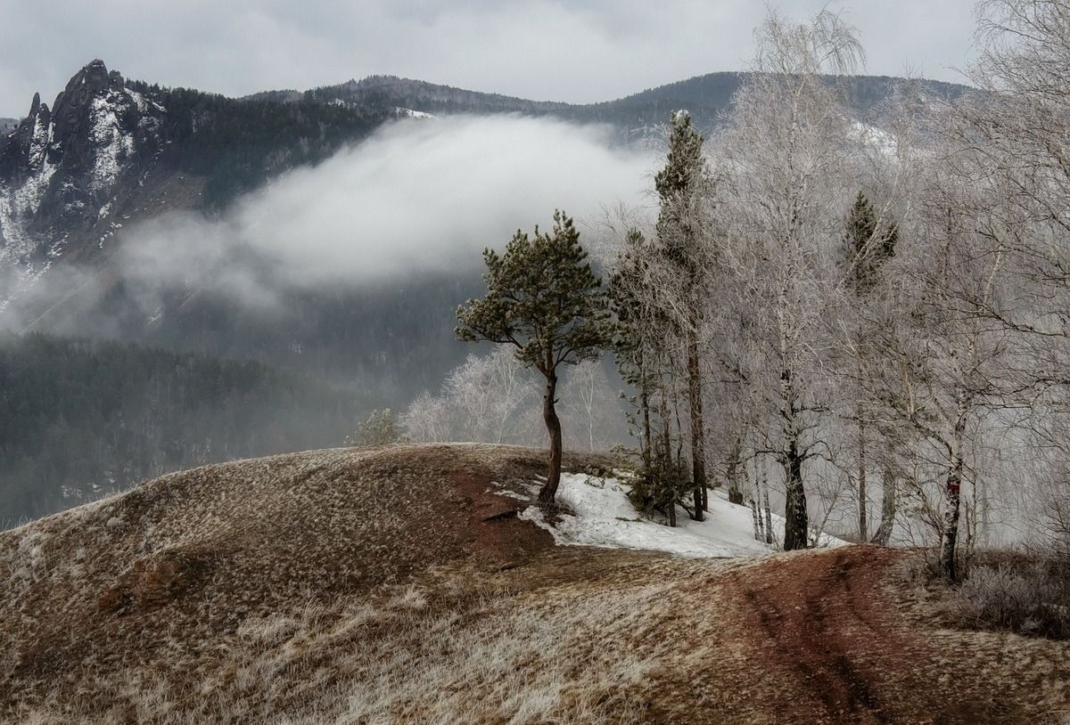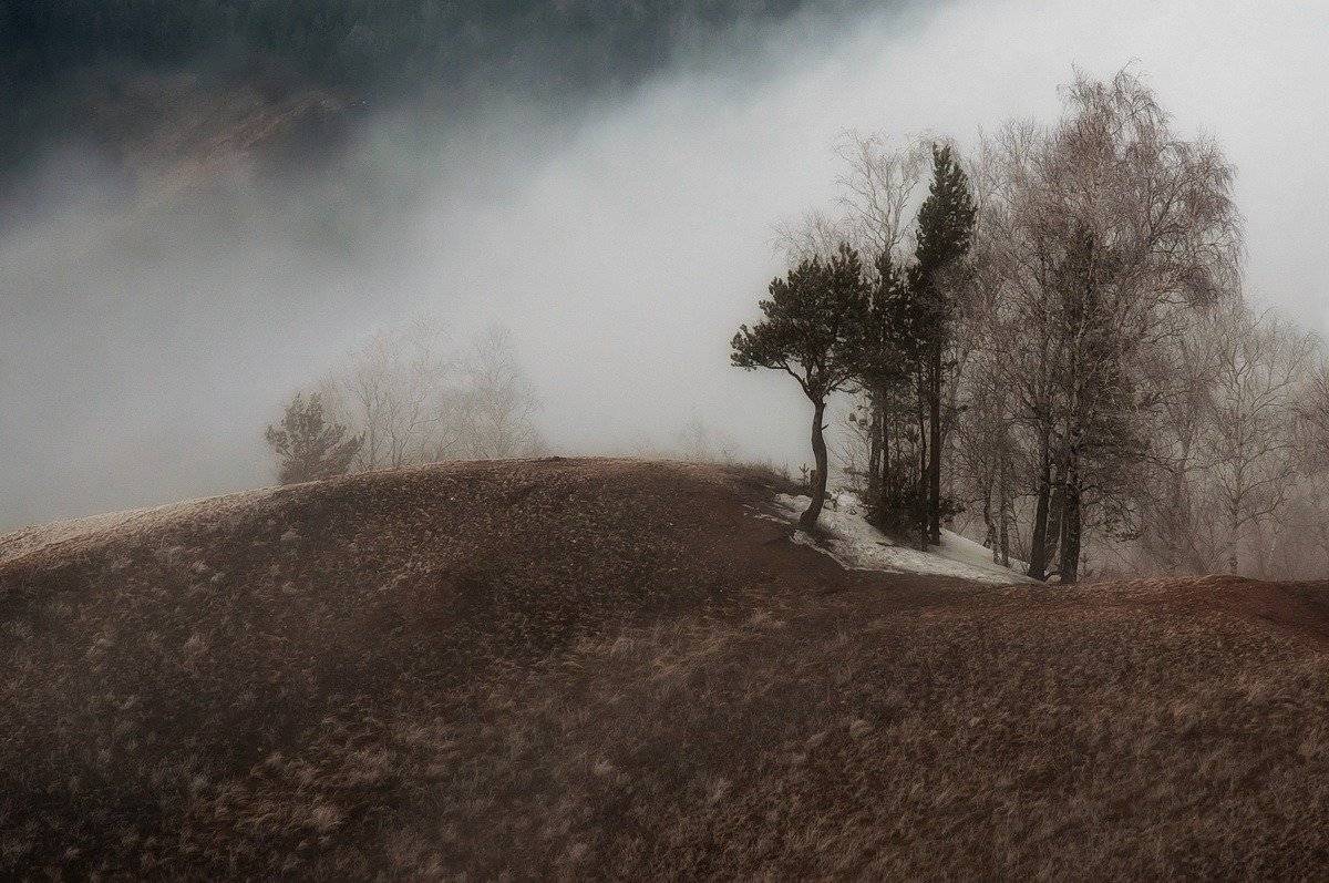 Торгашинский хребет.Туман быстро наступал, поглощая все на своем пути, потом так же быстро уходил, оставляя за собой легкий, едва видимый шлейф..В течении каких то десяти минут одно место выглядело совсем по разному.