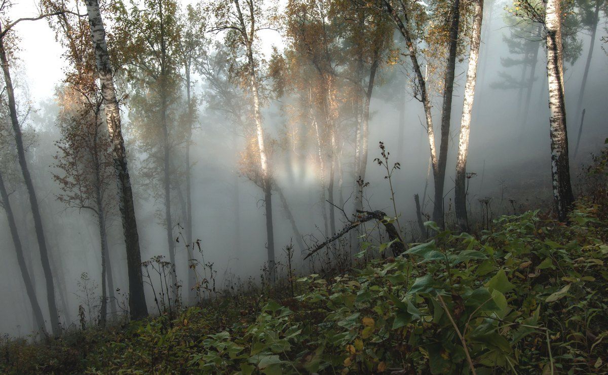 Крутые склоны Манской петли в туман совсем воспринимаются по другому..знакомые деревья приобретают очертания..высота совсем не ощущается.. все закрыто белой мглой.