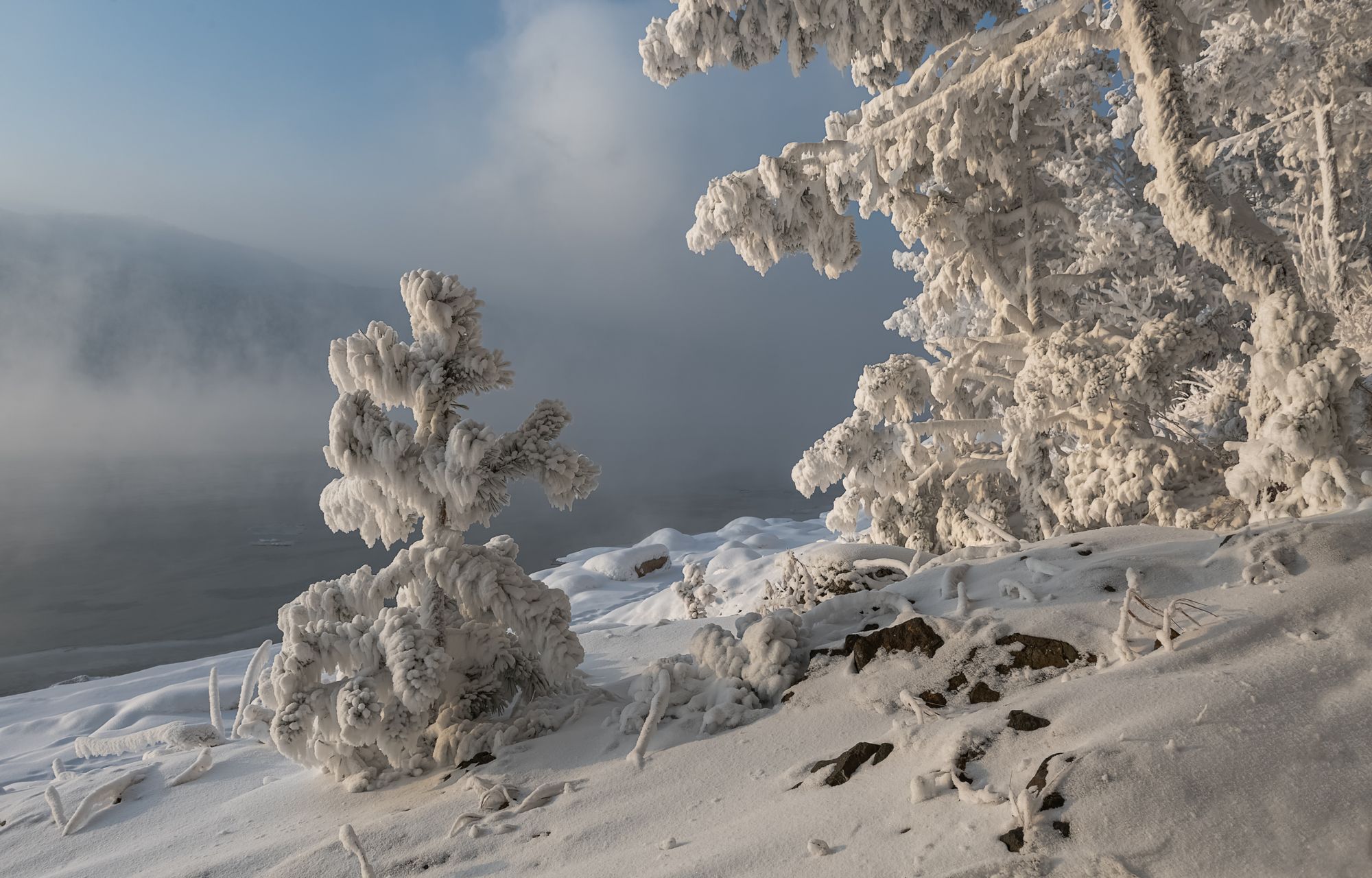 В большие морозы все деревья у реки покрываются толстым слоем инея. Берег превращается в настоящую сказку .Каждая веточка и каждый кустик смотрится как настоящее украшение.