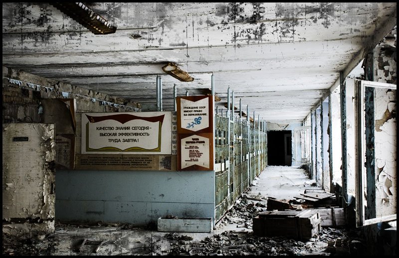 Школа в Припяти, Чернобыльская зона отчуждения. Здание в аварийном состоянии, ходить по нему опасно, полы проваливаются, - а плакаты прекрасно сохранились.