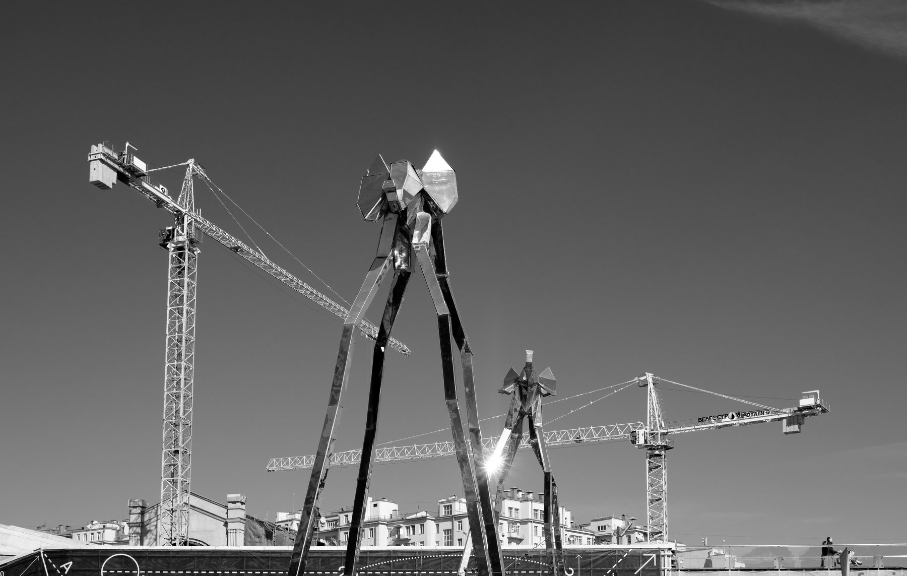 зеркала, слоны, строительные краны, небо, зеркальные слоны, Москва, патриарший мост, марсианские треножники, чертёж, Дмитрий Ткаченко