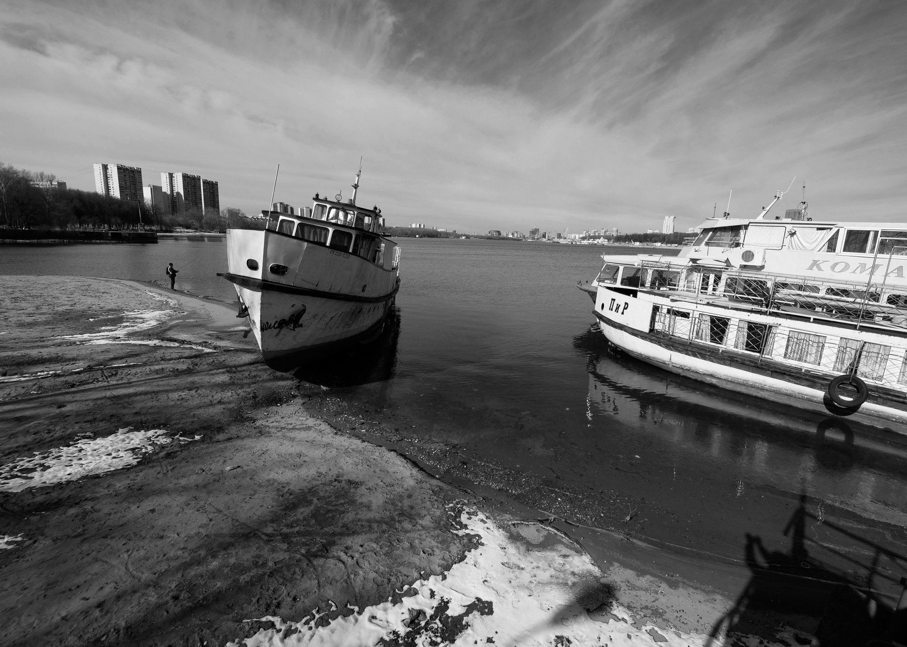 Корабли, река, вода, озеро, рыбак, отмель, снег, зимовка, затон, начало навигации, Дмитрий Ткаченко