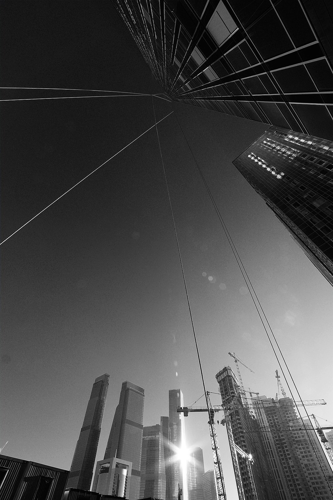 Небоскрёбы, Шелепиха, МДЦ, отражение, сияние, солнце, краны, тросы, Дмитрий Ткаченко