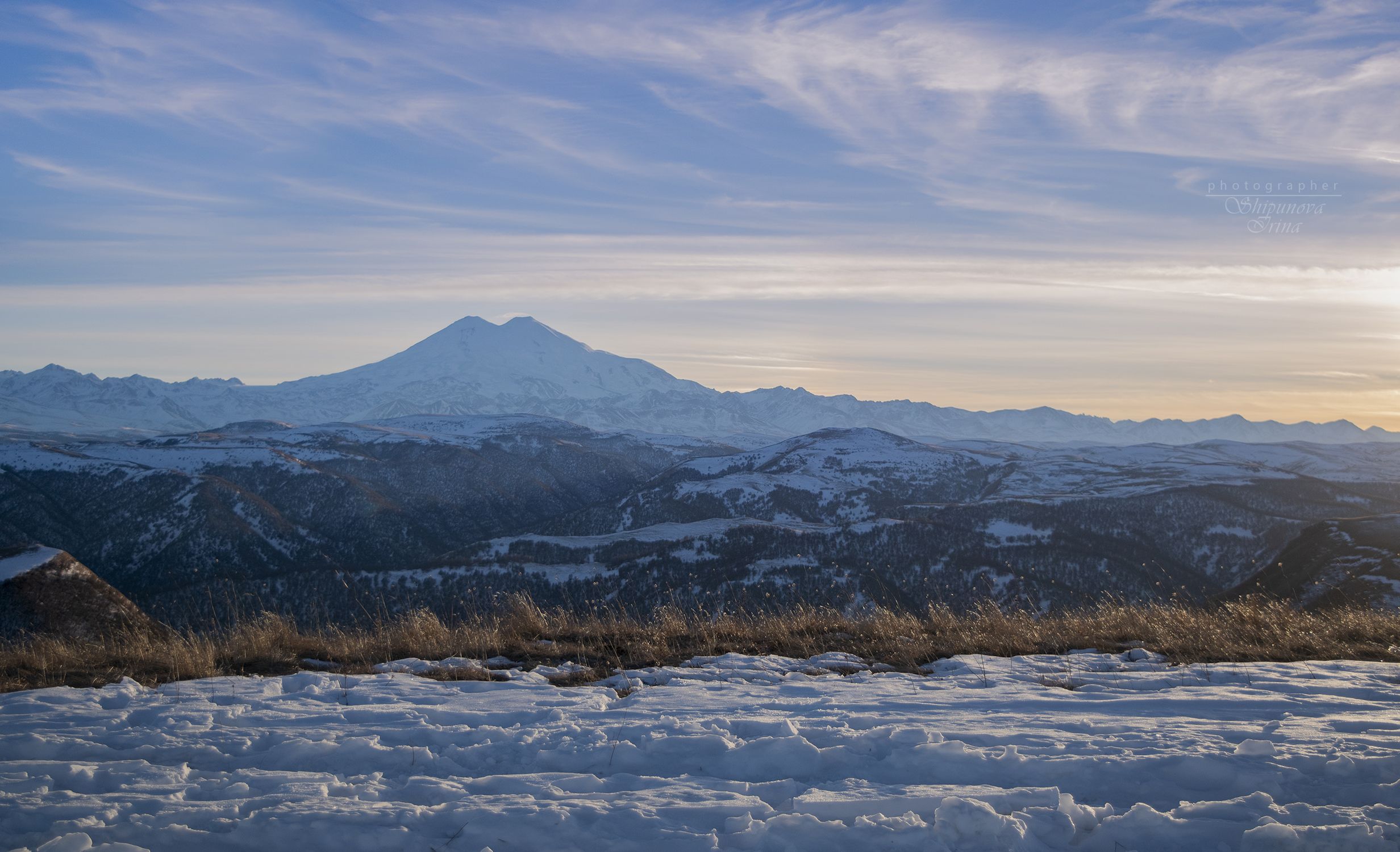 Вид на Эльбрус с плато Шаджатмаз. 6 января 2024 г. Закат