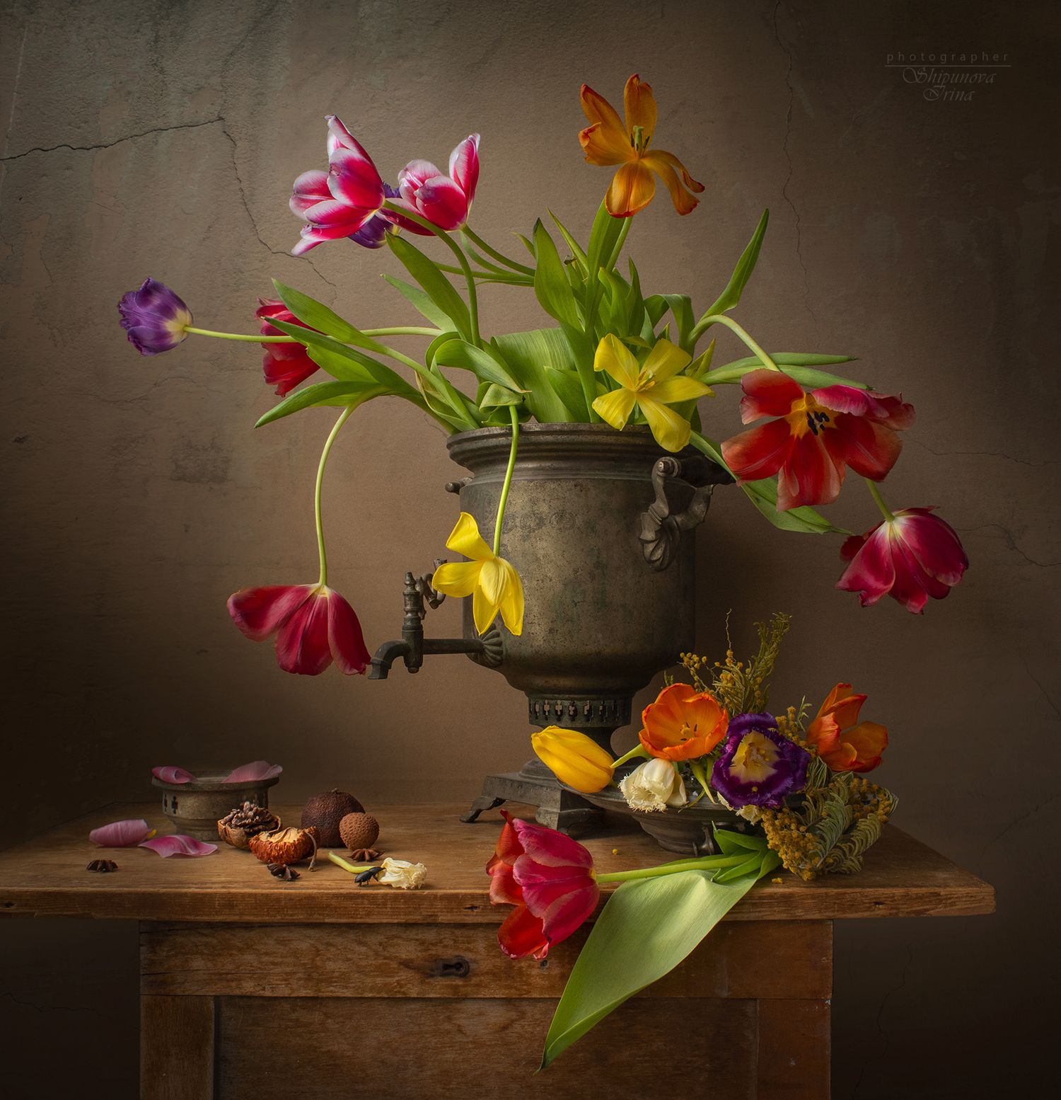 На изображении — натюрморт с тюльпанами в антикварном кувшине, стоящем на потёртом деревянном столе. Цветы в разной фазе жизни: одни раскрыты, другие опустили головы. Вокруг — орехи, лепестки, тёплый свет, подчёркивающий текстуры. Сцена передаёт тонкое равновесие между красотой и увяданием, характерное для классического натюрморта.
