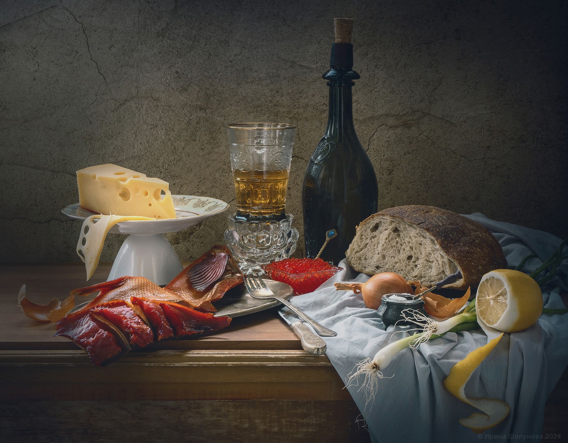 На деревянном столе — скромный, но насыщенный натюрморт: кусок балыка, твёрдый сыр на подносе, кусок ржаного хлеба, бутылка вина и стакан с янтарной жидкостью. Рядом — лук, лимон с кожурой, красный перец. Тёплый, мягкий свет подчёркивает фактуру продуктов, создавая ощущение домашнего уюта и традиционного застолья. Композиция передаёт простоту и насыщенность вкуса, характерную для русской кухни. Фотография Ирины Шипуновой — как память о тёплом вечере за столом.
