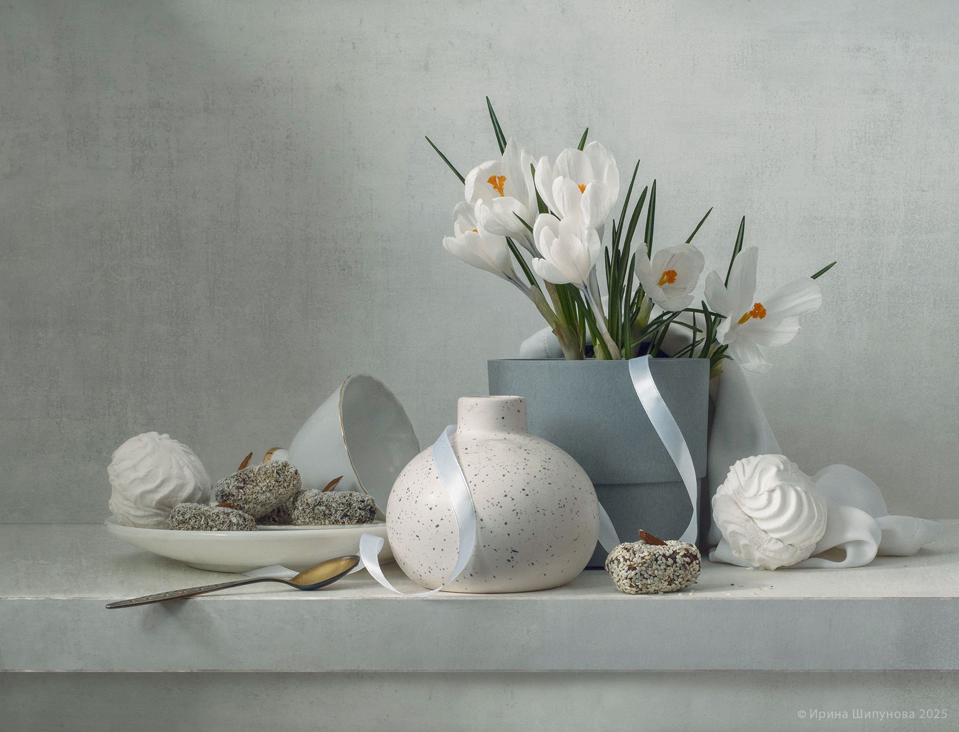 На каменном столе — нежный натюрморт: белые крокусы в сером вазоне, украшенном лентой, рядом — керамические вазы и тарелка с мeringue и шоколадными шариками. Светлые тона, мягкий свет, утончённая простота — как будто весна уже входит в комнату. Фотография передаёт ожидание пробуждения природы в спокойной, уютной атмосфере.
