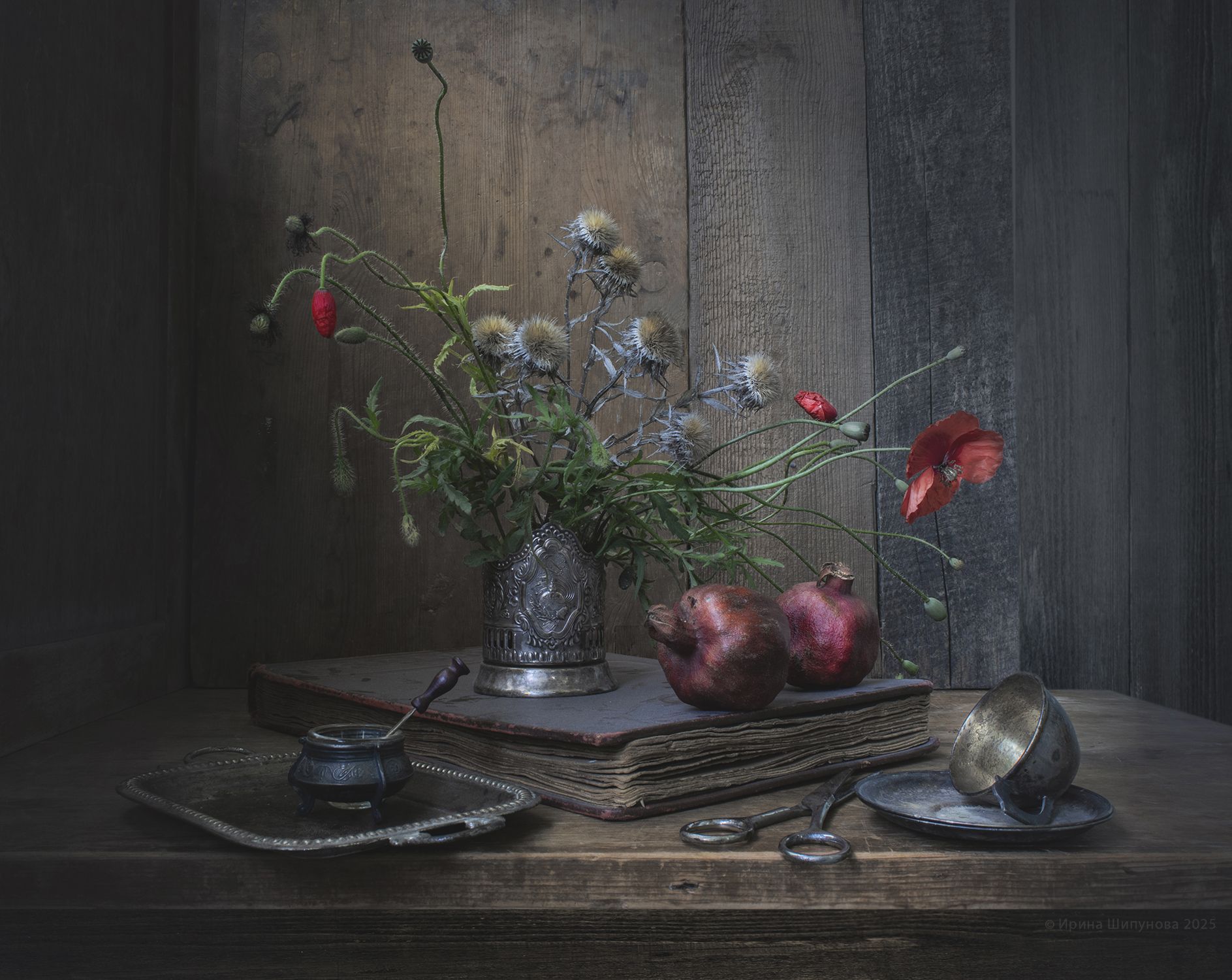 На изображении — тщательно выстроенный натюрморт: ваза с увядшими маками стоит на старинной книге, рядом — гранаты, серебряная чаша и ложка. Деревянный фон и мягкий свет создают атмосферу уюта и прошлого. Композиция передаёт тонкую грусть и красоту увядания, характерную для классических натюрмортов. Фотография Ирины Шипуновой отражает мастерство в передаче текстур и света, подчёркивая вечность и трансформацию.