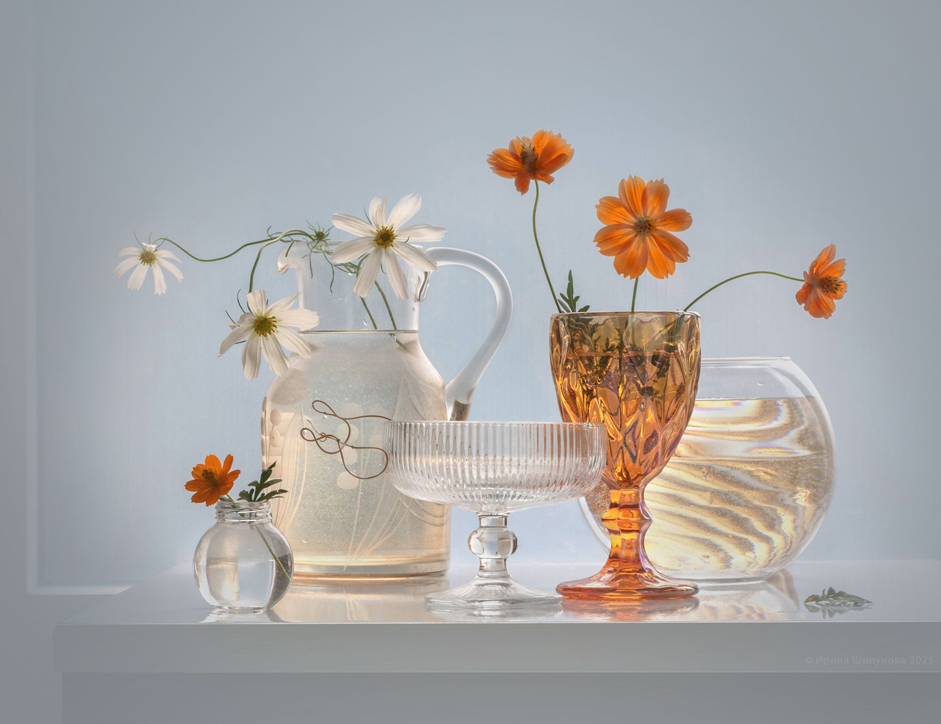 В тишине светлого интерьера космеи, вставленные в разнообразные стеклянные сосуды, словно оживают под мягким светом. Прозрачность ваз, игра отражений и контраст белых и оранжевых цветов создают гармоничную композицию, где каждая деталь — часть целого. Это не просто натюрморт, а мгновение, застывшее в стекле и свете.