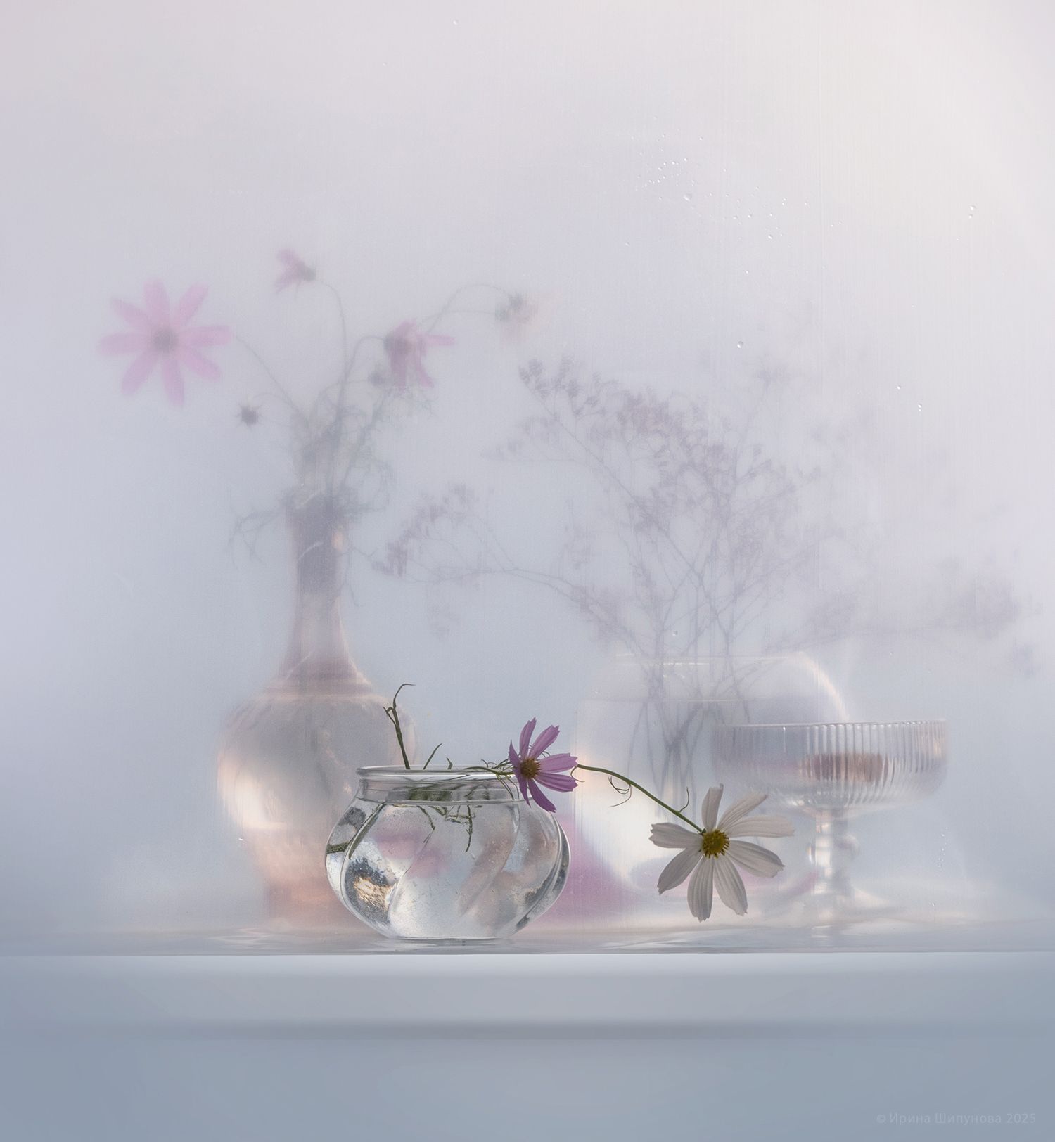На изображении — композиция из стеклянных ваз с космеями и ромашками, погруженных в легкую дымку. Свет проникает сквозь туман, создавая эффект невесомости. Фотография передает ощущение тишины и умиротворения, словно цветы находятся в невесомости. Работа Шипуновой Ирины — это игра света, прозрачности и пространства.