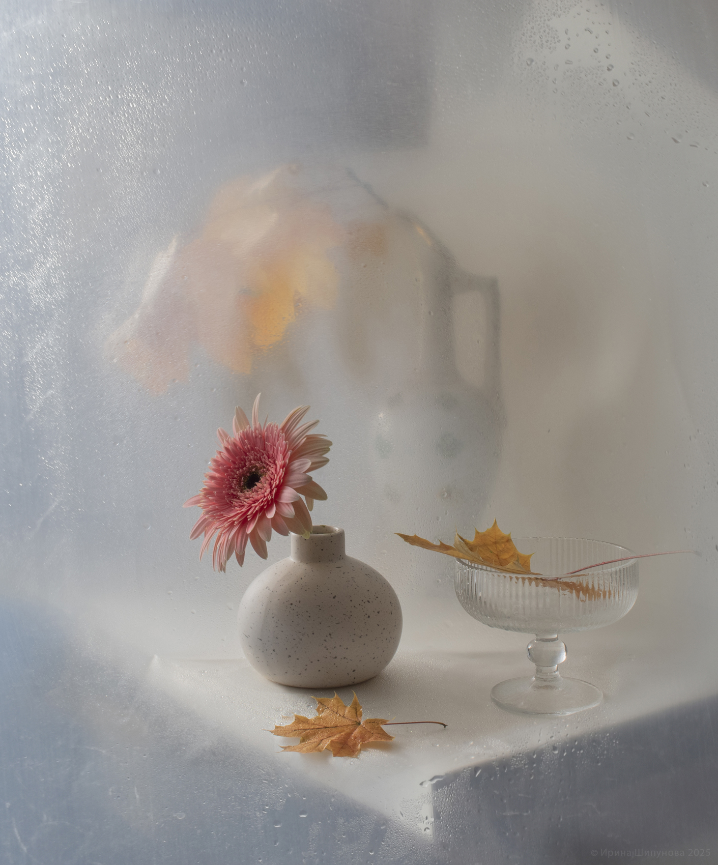 В кадре — тонкая поэзия увядания. Сухие листья, розовый цветок в грубой глиняной вазе и стеклянная чаша с листом — всё словно замерло в ожидании. Запотевшее стекло в фоне создаёт ощущение дыхания, тумана, внутреннего раздумья. Это не просто натюрморт — это метафора прощания, тоски по уходящему времени. Свет мягкий, почти прозрачный, будто осень плакала, оставив следы на стекле. Фотография Шипуновой Ирины — как молчаливый дневник чувств.