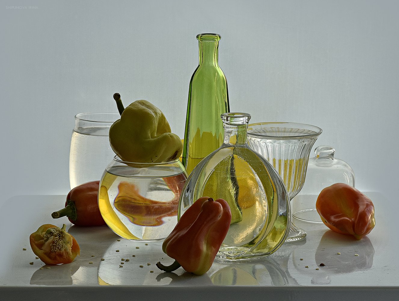 2) Если название перец и стекло, то между предметами двух групп должна быть какая-то взаимосвязь помимо цветовой композиции? Или идея сблизитъ зеленый стекла с красным перцев через желтые рефлексы?