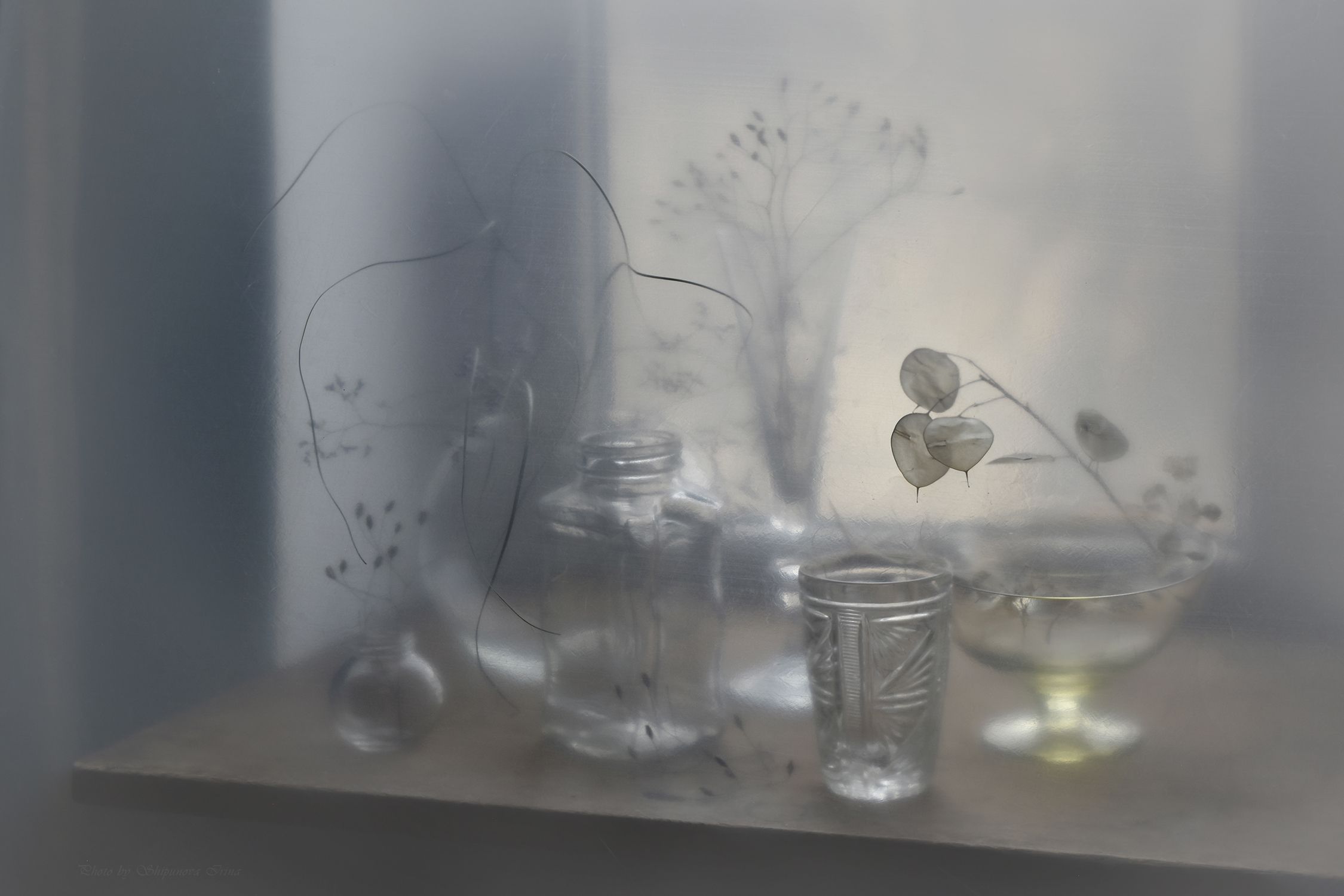 На полке, озарённой мягким, рассеянным светом, стеклянные предметы и сухие веточки словно замерли в моменте. Их прозрачные очертания, размытые и нерезкие, напоминают о фрагментарности воспоминаний — нечто, что есть, но уже уходит. Фотография передаёт ощущение тихой утраты, незаметного течения времени, где каждая деталь — от блика на стекле до тени на стене — становится метафорой мимолётности. Это не просто интерьер — это размышление о том, что остается после.
