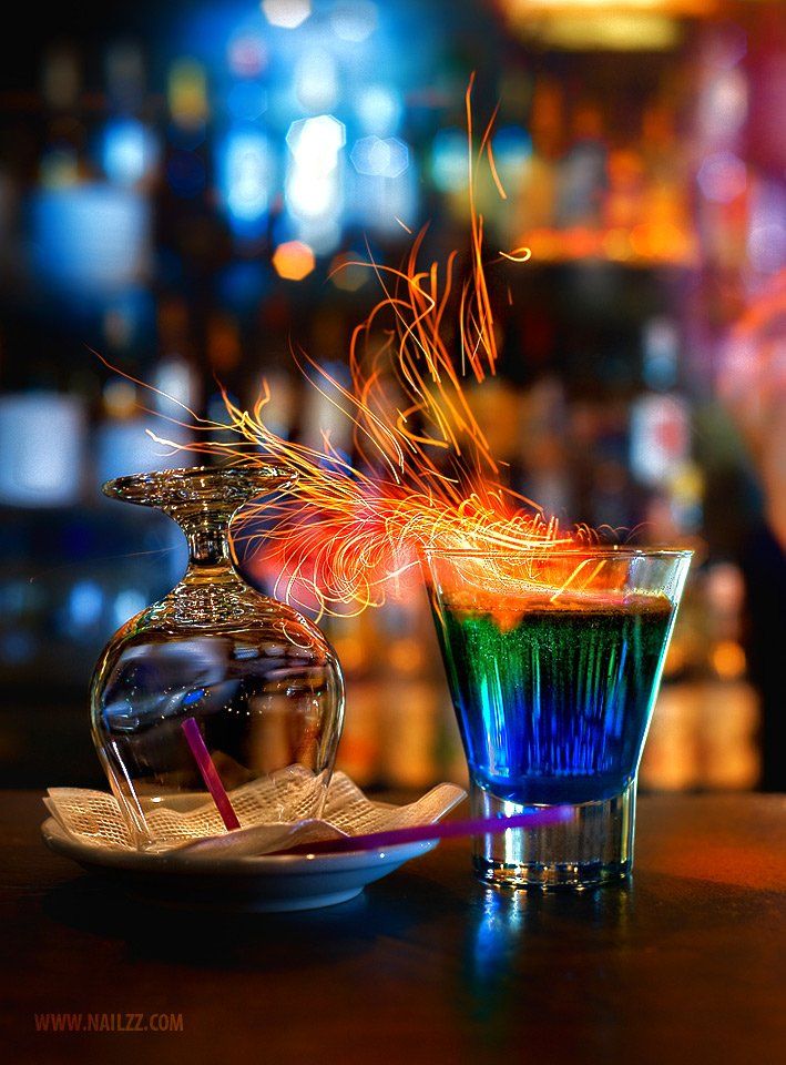 Блю Курасао и абсент + корица сверху на огонь? Странный коктейль.. но по сочетанию цветов и огненному эффекту - нравится:)