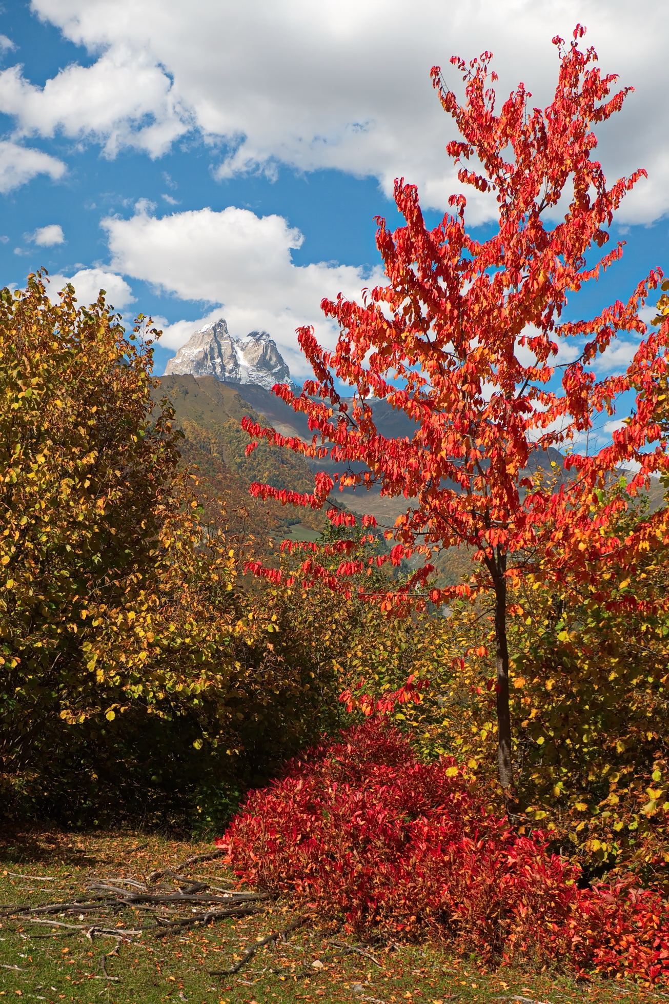 Получилось неплохо. Красный куст и дерево выделяются на фоне гор — ярко, свежо. Небо с облаками добавляет света. Можно чуть больше упора на глубину — внизу земля с ветками чуть затенена, но в целом — хорошо.
