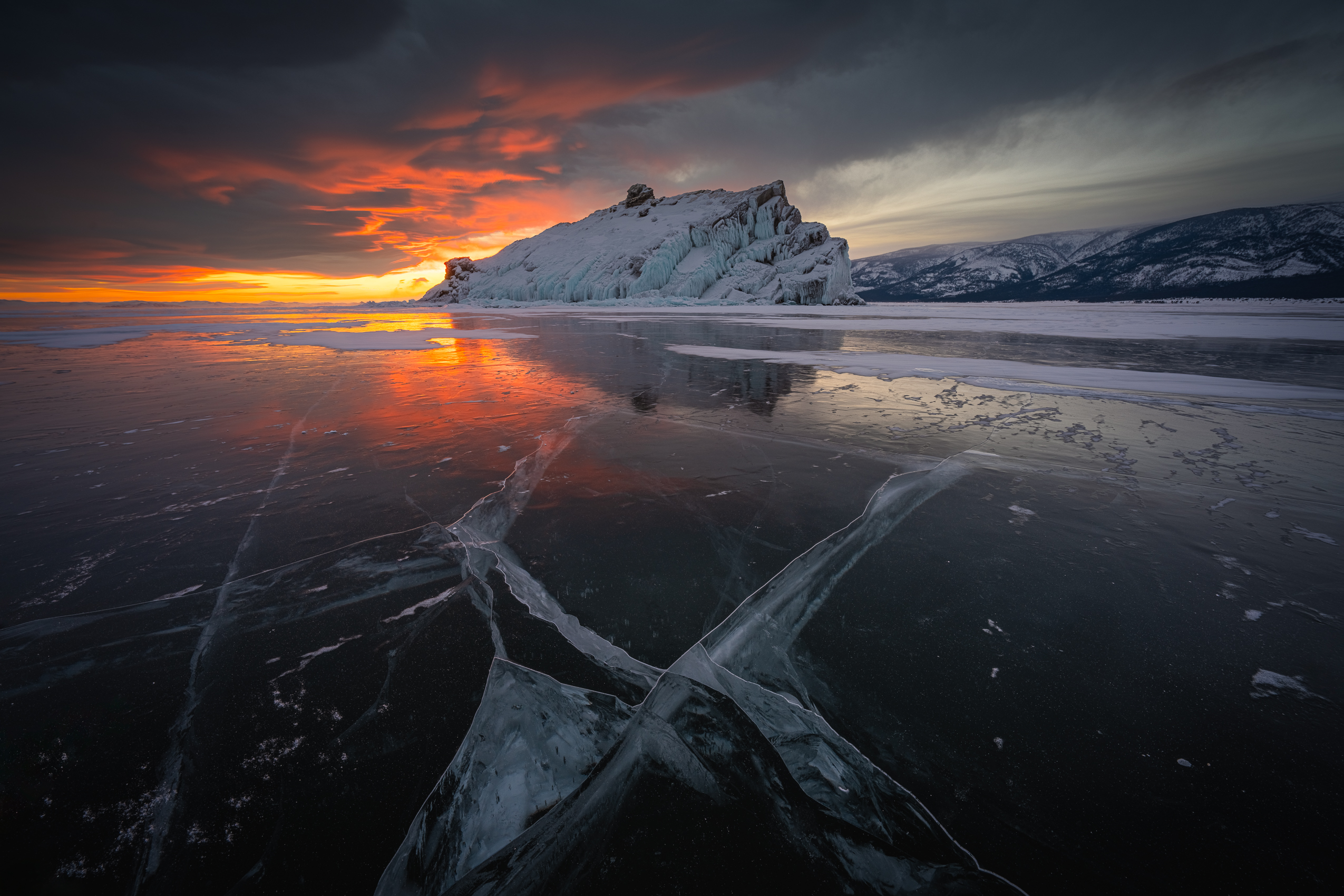 На фотографии запечатлен один из самых живописных уголков озера Байкал — мыс Еленка. Вечернее небо окрашено в яркие оранжевые и красные тона, которые контрастируют с холодными оттенками льда и снега. Скалистый берег, покрытый инеем, возвышается над замерзшей поверхностью водоема. На переднем плане видны характерные трещины и узоры на льду, подчеркивающие его толщину и прозрачность. Это изображение передает суровую красоту зимнего Байкала, где природа демонстрирует свою мощь и величие в момент заката. Работа выполнена фотографом Mikhail Ioannisian.
