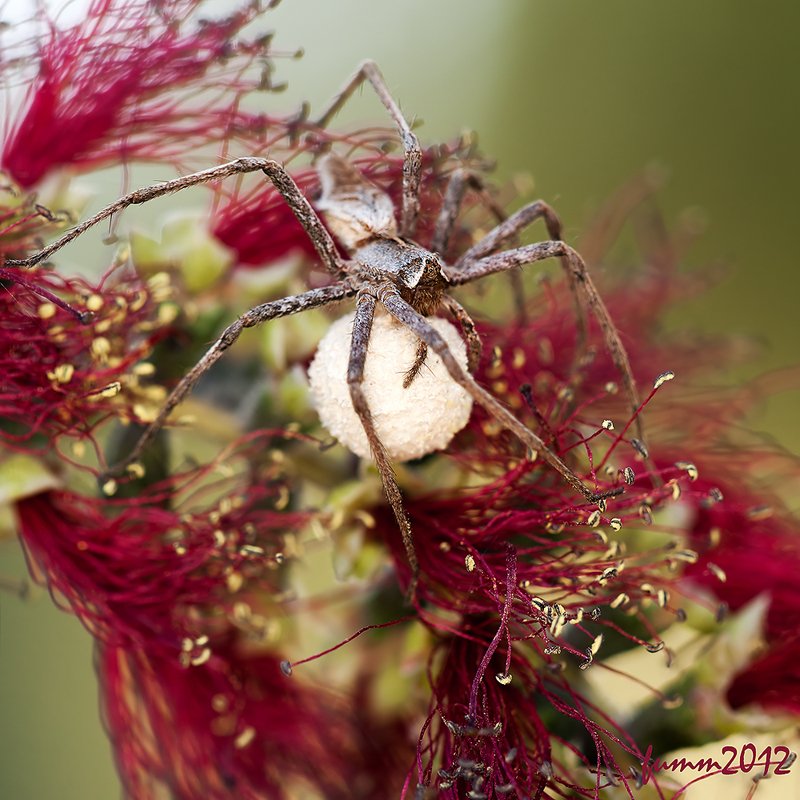 Еще один из видов пауков -охотников:пизаура.Носит кокон с яйцами на себе.В последние недели "беременности строит сводчатое гнездо и прячет там кокон, оставаясь подле него.Однажды мне повезло принимать "роды" и я видел (и снимал!!!) сам момент выхода младенцев.Видимо по сигналам окрепших в коконе малышей, мать разрывает кокон сильными лапами и выпускает их на свет в самостоятельную жизнь.А некоторые виды охотников какое-то время таскают малышей на спине.Видел и снимал однажды,но очень давно и не очень качественно .Это пока в мечтах.
