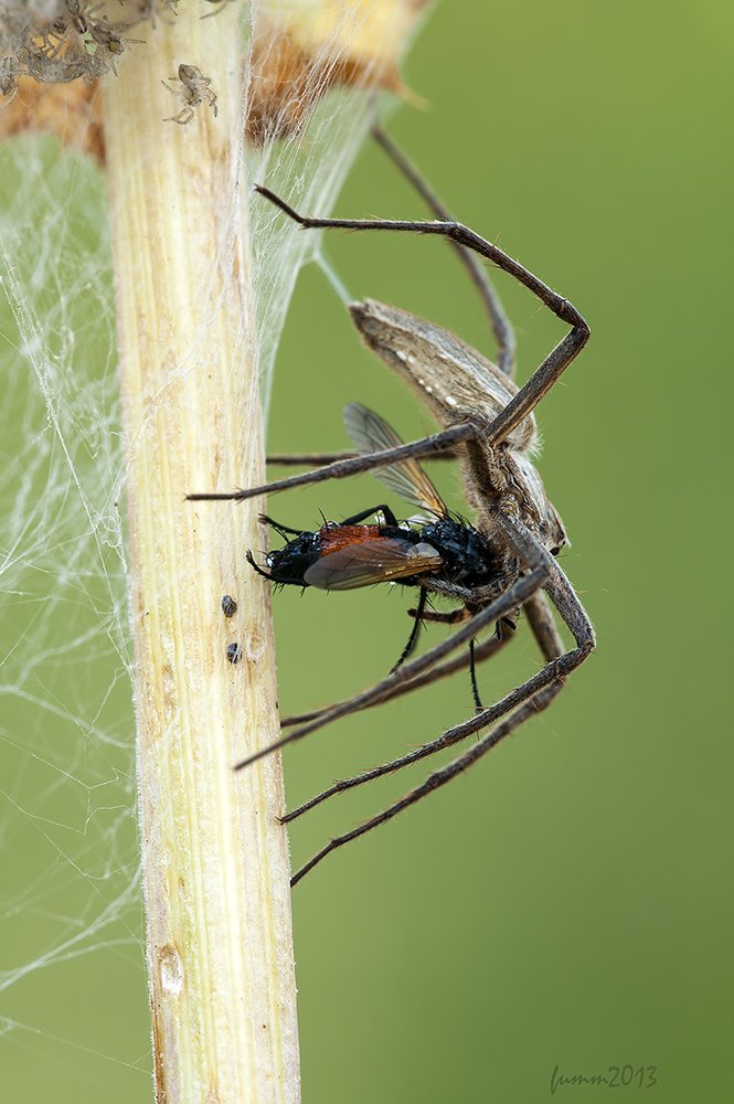 Эти малыши в верхней части кадра вышли из кокона буквально несколько мгновений назад, уже после того, как мамка схватила неудачно приземлившуюся сонную ежемуху.На первых кадрах серии деток еще нет.Да и заметил их я только дома на компе... Прозевал такой момент, увлекшись охотой пизауры.