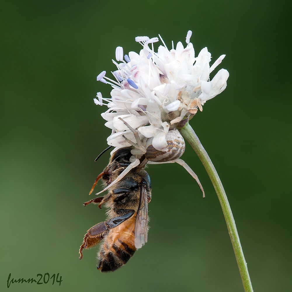 Мимикрирующий хищник, маскируясь в цветке, поджидает обреченную добычу и одним коротким броском решает исход возможного поединка, хватая пчелку за загривок и парализуя своим ядом. А всему виной цветок!