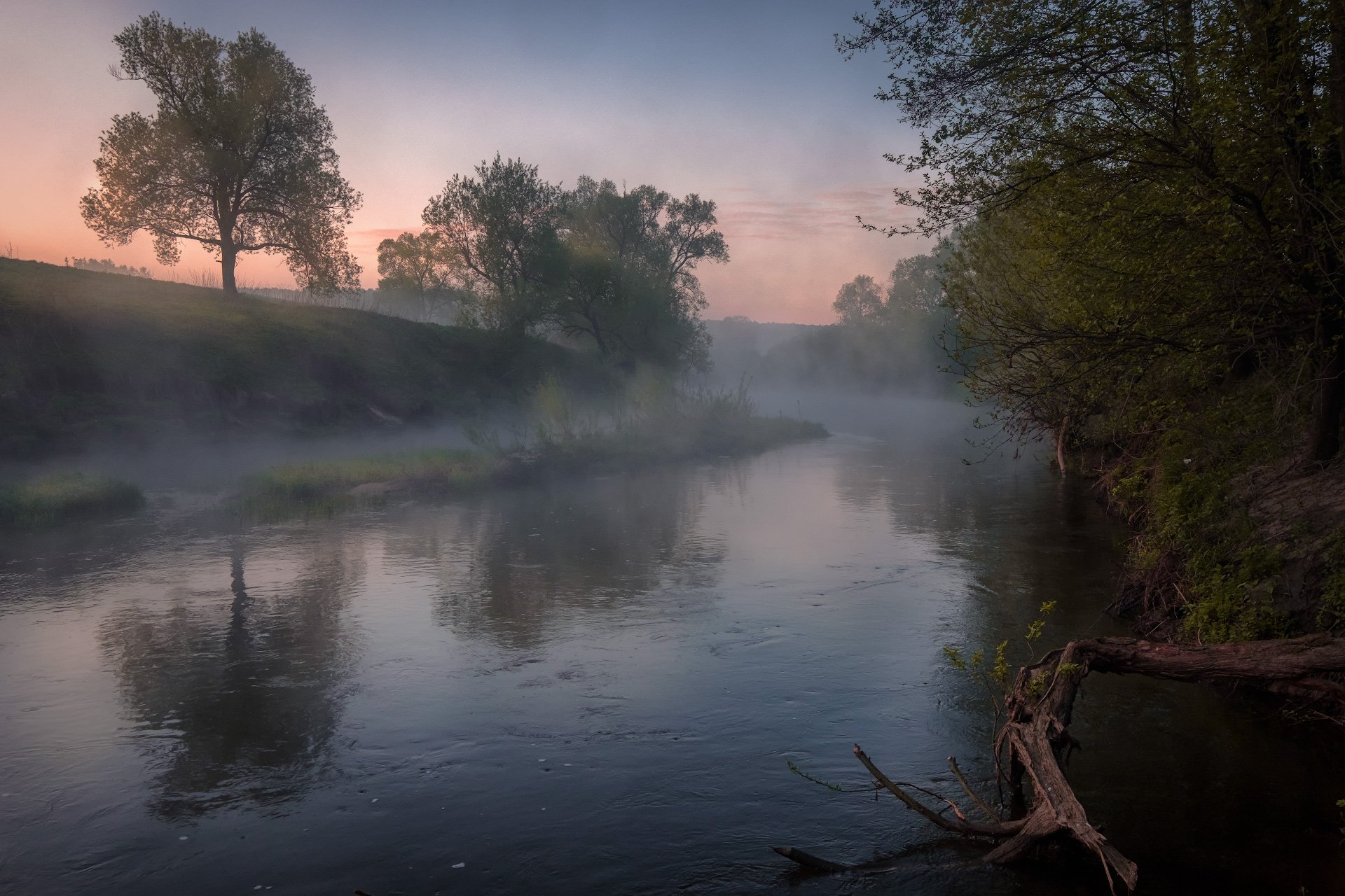 пейзаж, река, осетр, рассвет, туман, утро, отражения, природа, деревья, Андрей Чиж