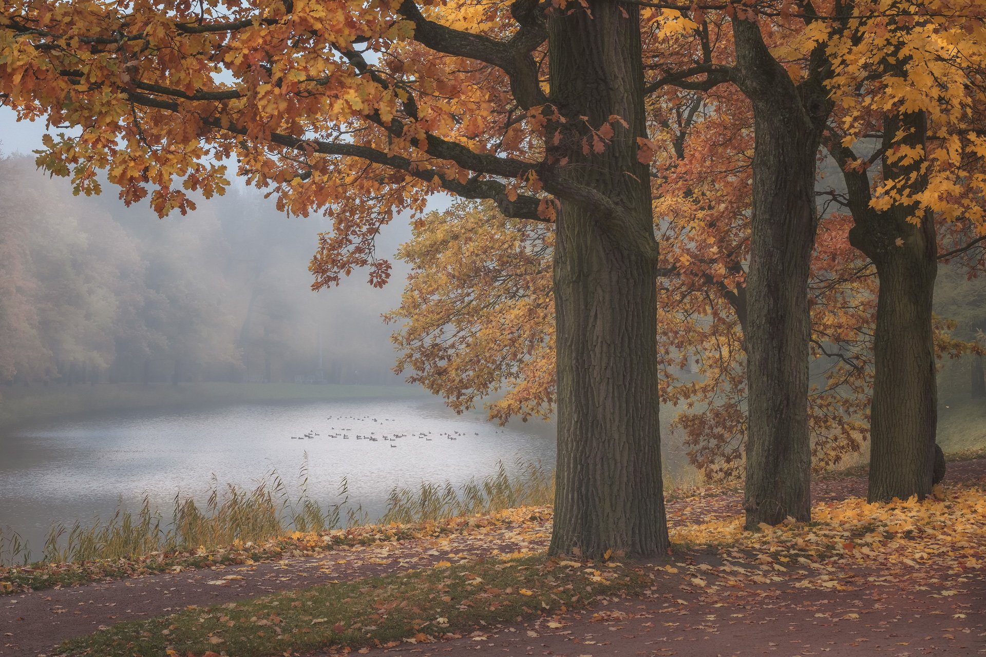 пушкин, царское село, парк, пруд, туман, осень, дубы, октябрь, золотая осень, листопад, утро, рассвет, Андрей Чиж