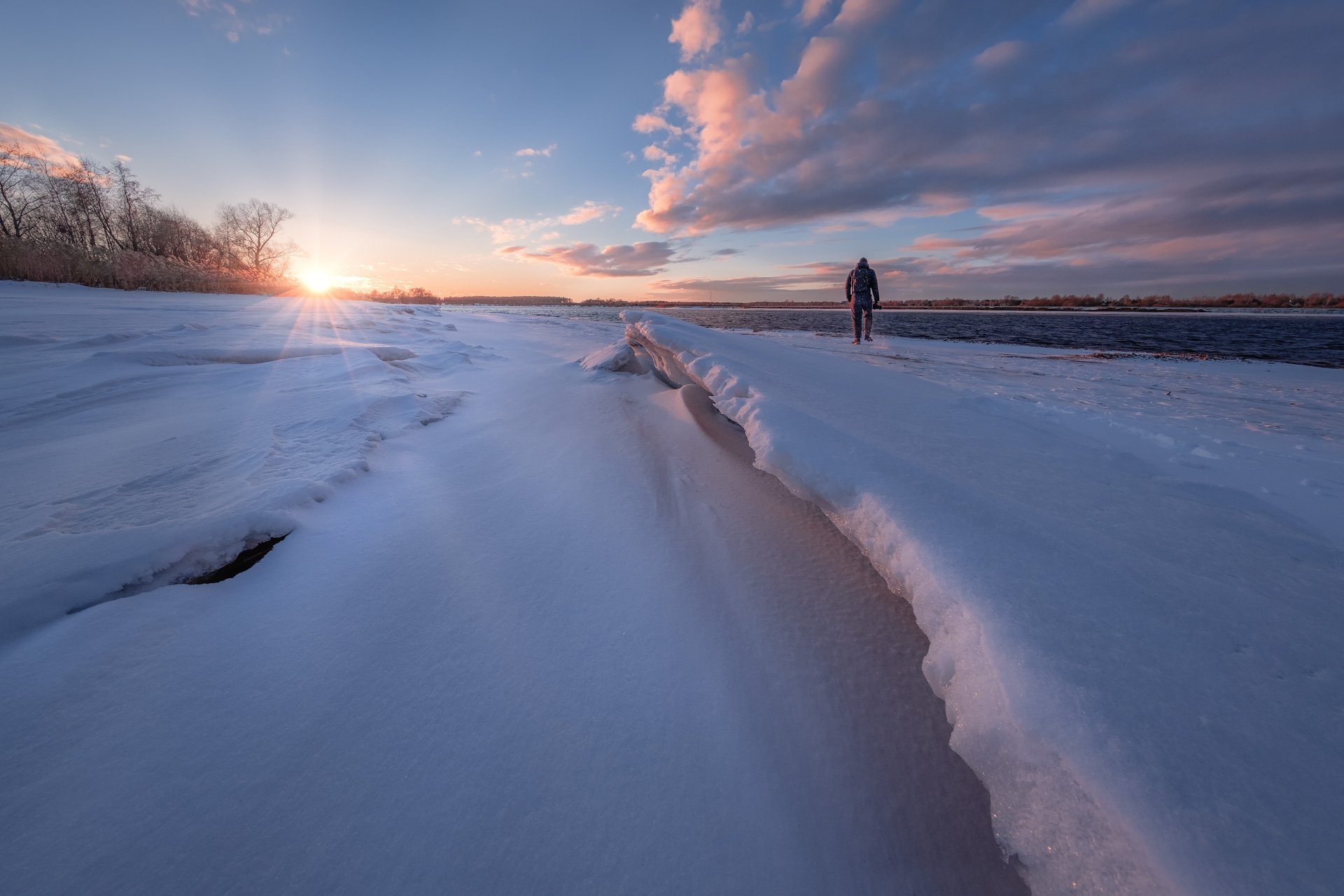 дубна, волга, ратмино, пейзаж, закат, солнце, берег, лед, снег, вода, река, фотограф, Андрей Чиж