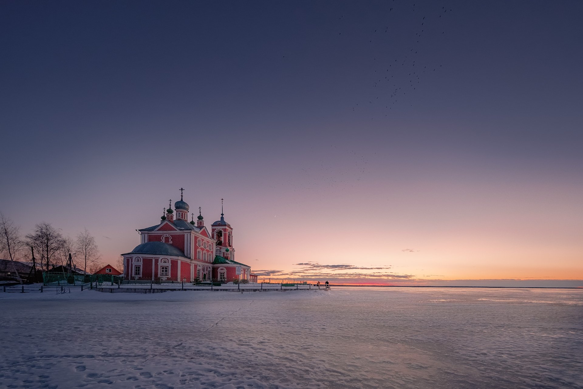 плещеево, озеро, закат, храм, птицы, стая, март, лед, снег, переславль, переславль-залесский, Андрей Чиж