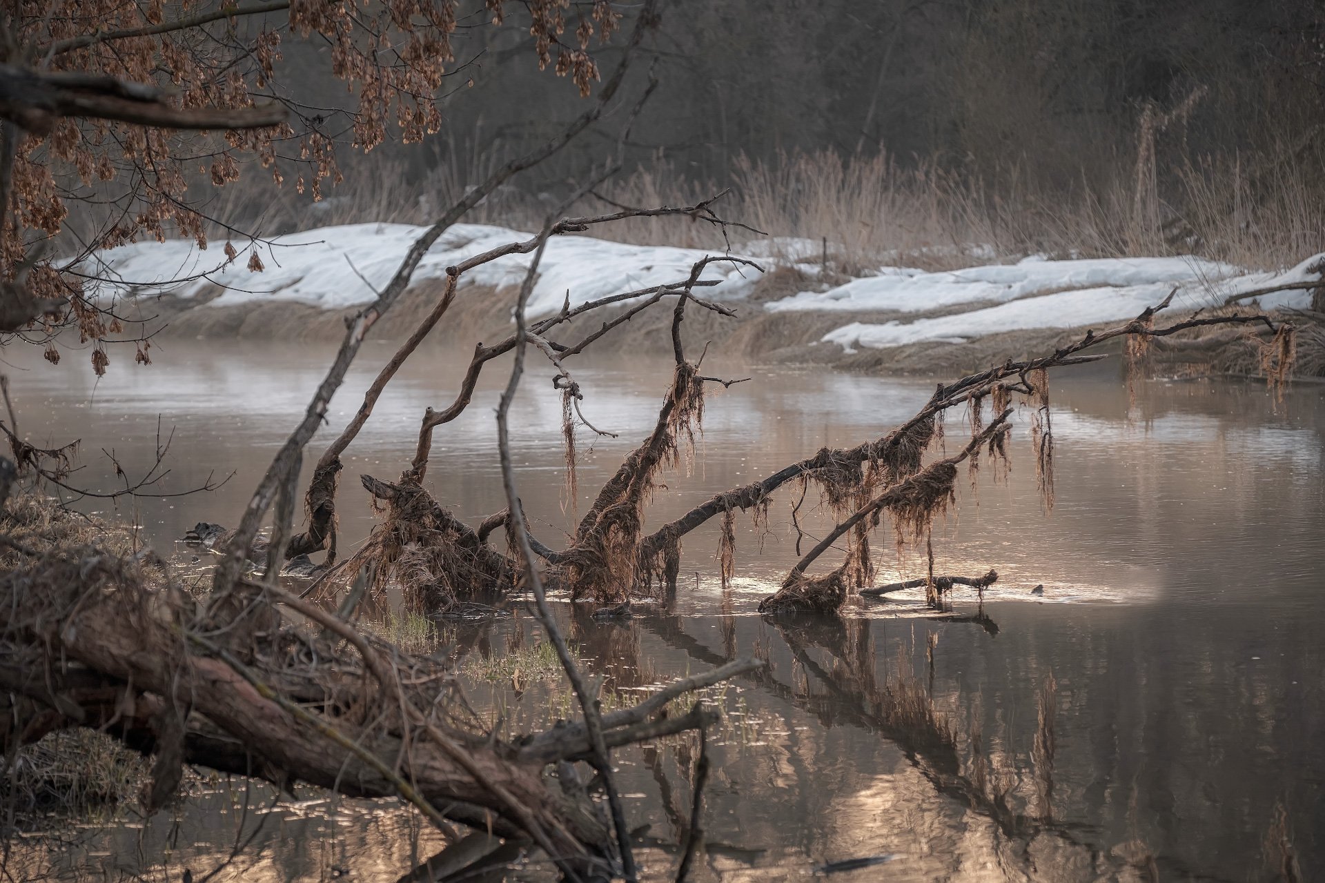 истра, река, вода, водяной, коряга, отражения, март, тепло, рассвет, солнце, деревья, ветки, туман, Андрей Чиж