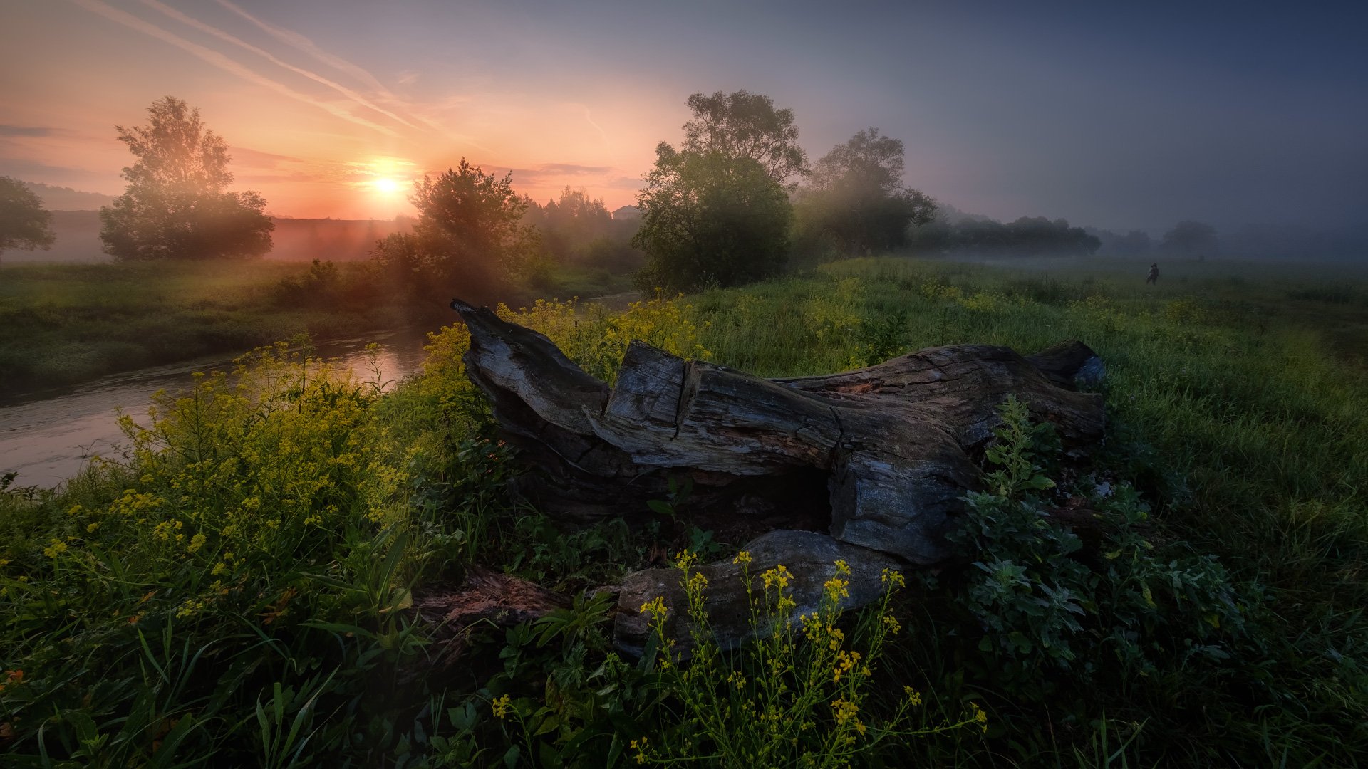 истра, река, коряга, пейзаж, рассвет, небо, следы, трассы, дерево, цветы, туман, утро, Андрей Чиж