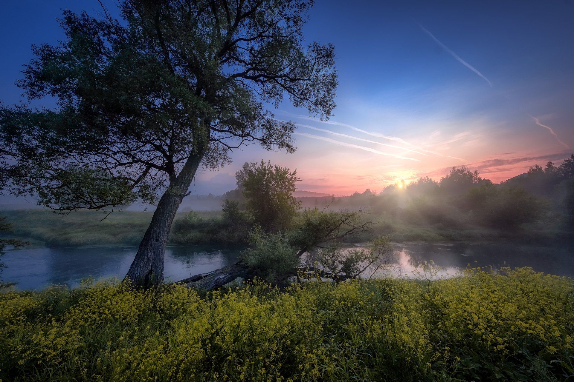 истра, река, пейзаж, рассвет, небо, следы, самолеты, трассы, дерево, цветы, туман, утро, Андрей Чиж