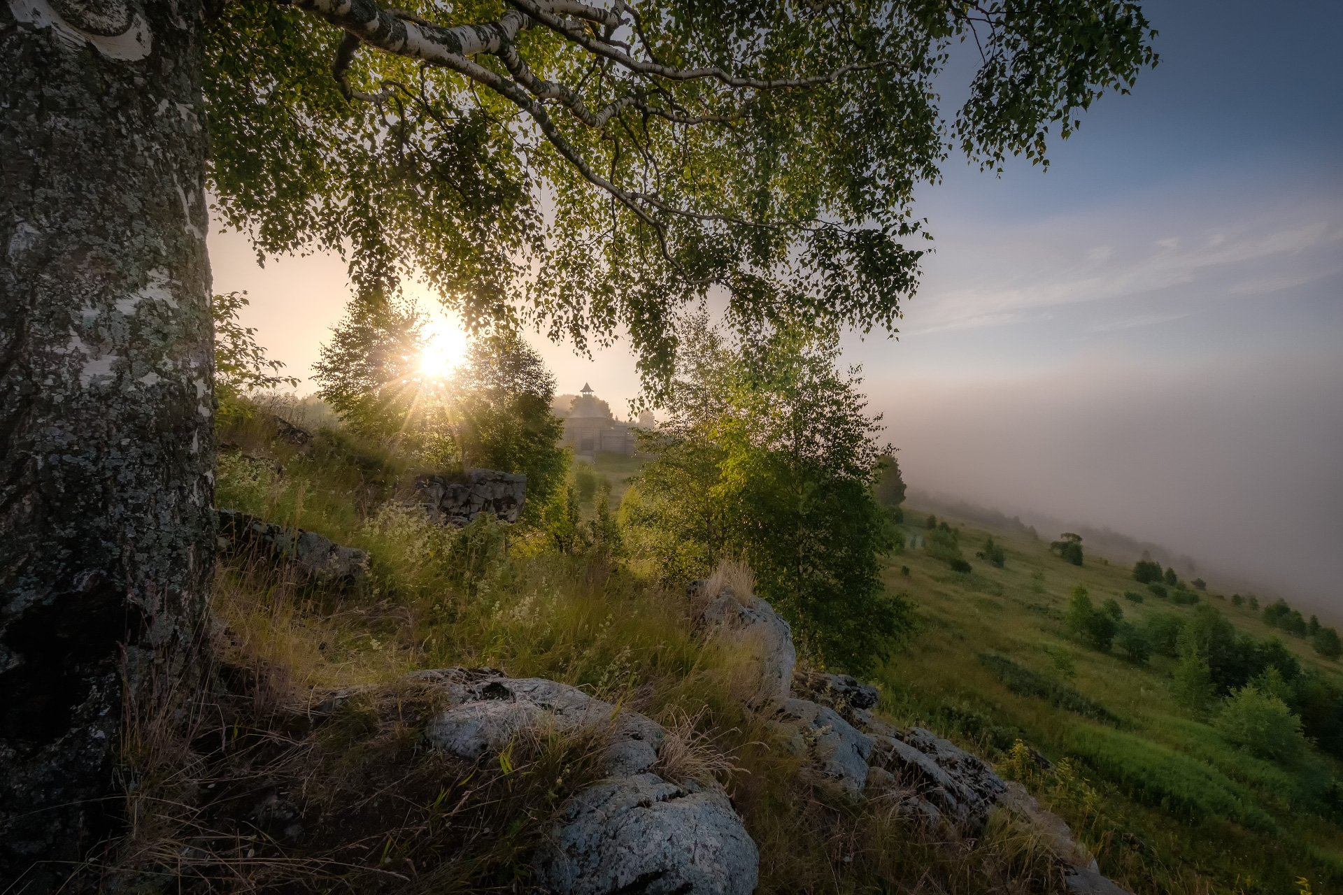 утро, рассвет, береза, склон, косьва, крепость, солнце, скалы, камни, Андрей Чиж