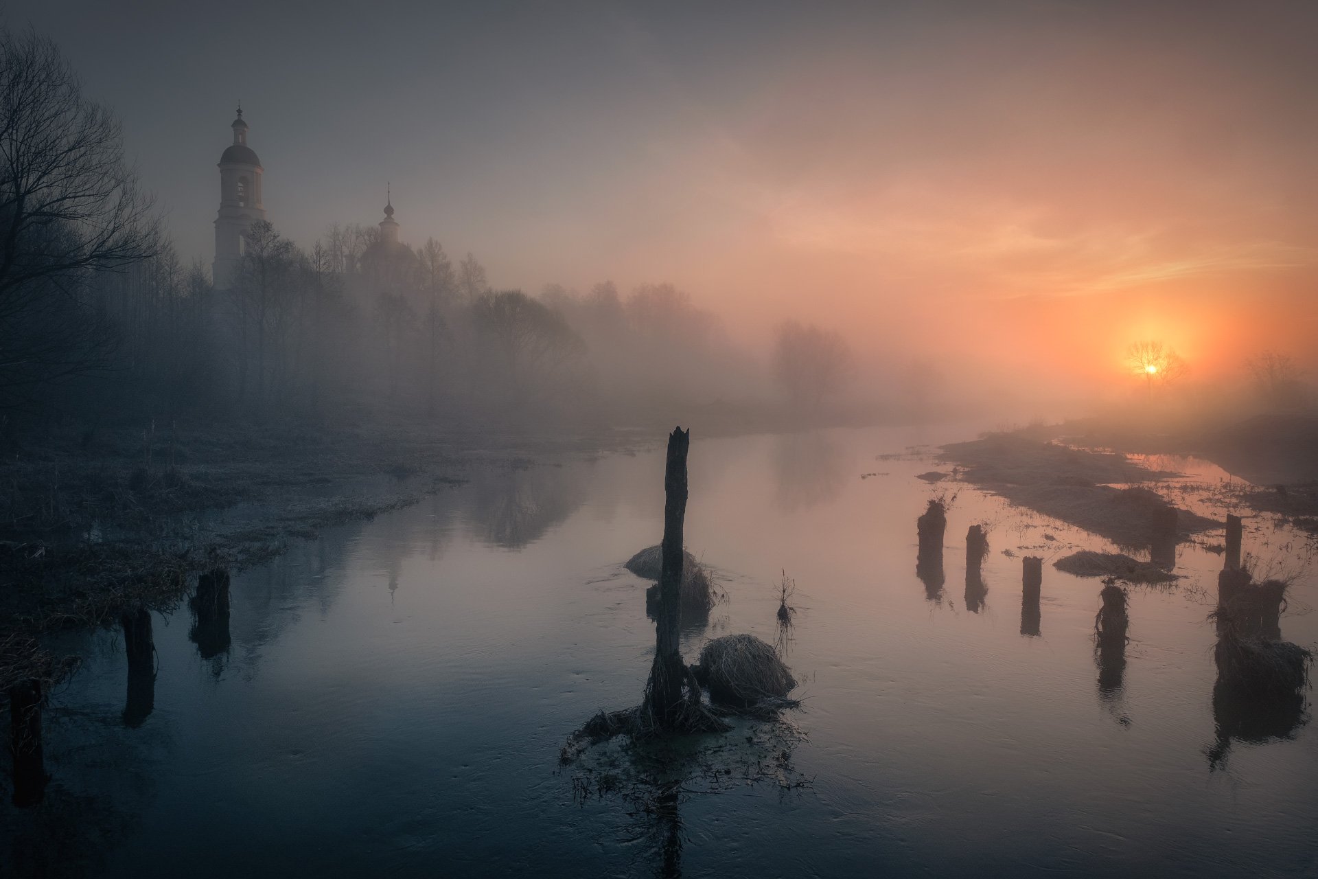 Холодное апрельское утро. Еще нет комаров и и влажных летних туманов. Снег сошел и река замерла перед паводком. Скоро она покажет свою мощь и характер.