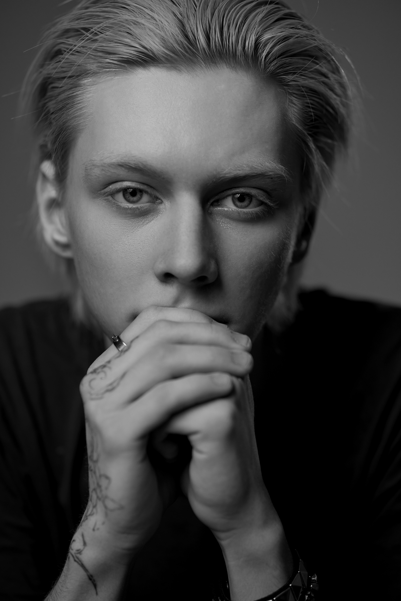 Чёрно-белый кадр фиксирует мгновение внутренней сосредоточенности. Молодой человек смотрит прямо в объектив, скрывая рот сложенными руками — жест, напоминающий молчание или сдерживание. Светлые волосы, татуировки на пальцах, тёмная одежда — всё подчёркивает контраст и глубину образа. Фотография передаёт не только внешность, но и атмосферу внутреннего напряжения, задумчивости. Работа Павла — пример сдержанной, но выразительной портретной съёмки, где каждая деталь несёт смысл.