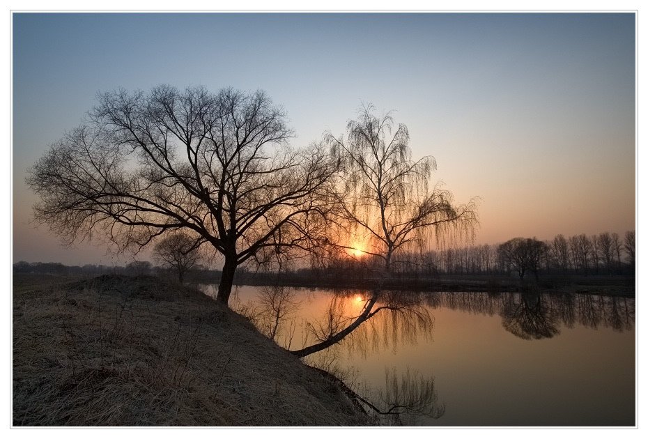 Глядя на картинку, у меня создается впечатление, что деревья провожают солнышко, притом березка выгнулась и подглядывает, бедняжке плохо видно. :))