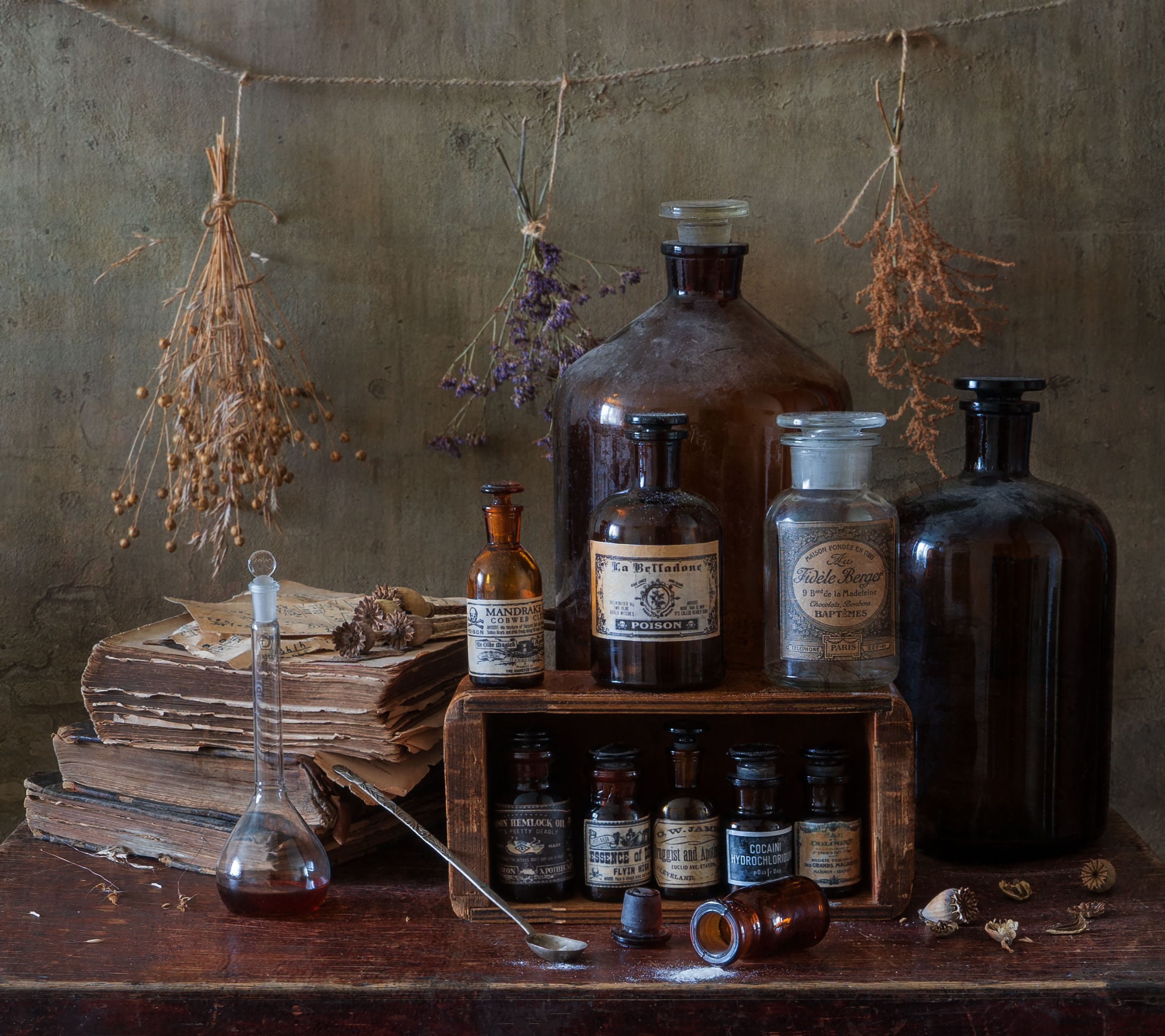 старые книги, склянки, бутылки, аптечный натюрморт,, Галина Тришина