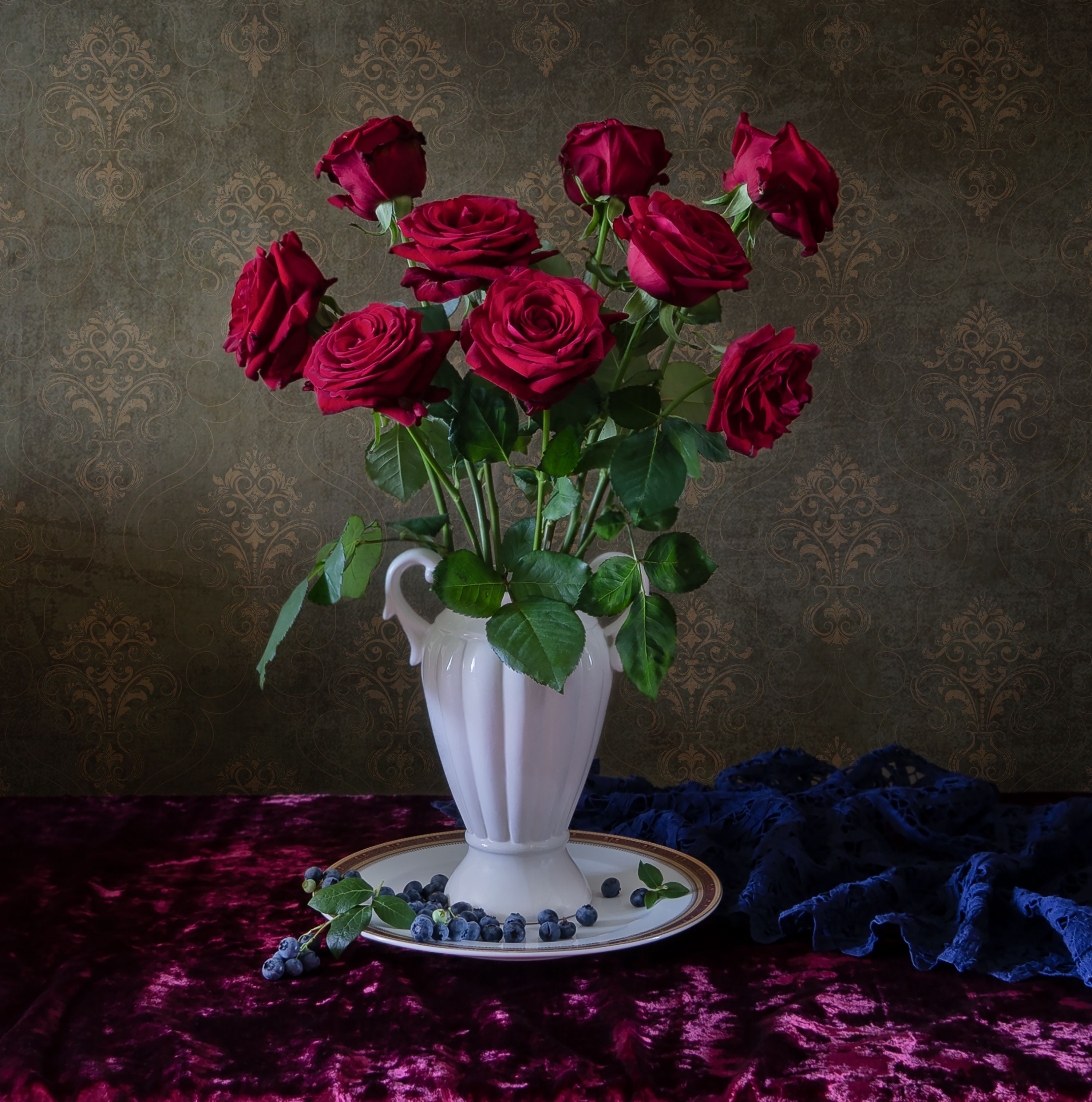 голубика, розы, букет, бархат, кружева, синий, бордо,, Галина Тришина