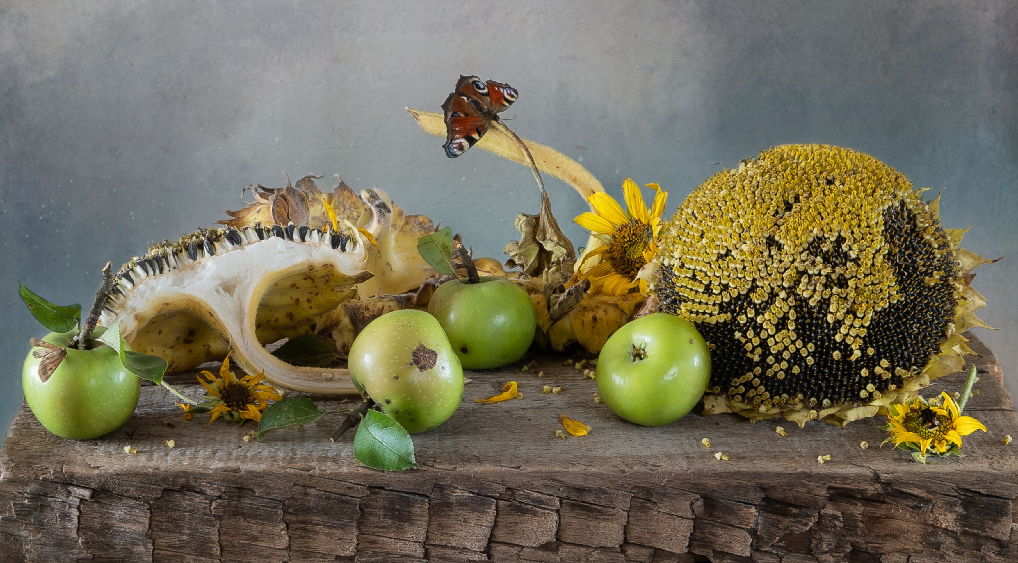 бабочки, яблоки, подсолнухи, шмель, сентябрь, Галина Тришина